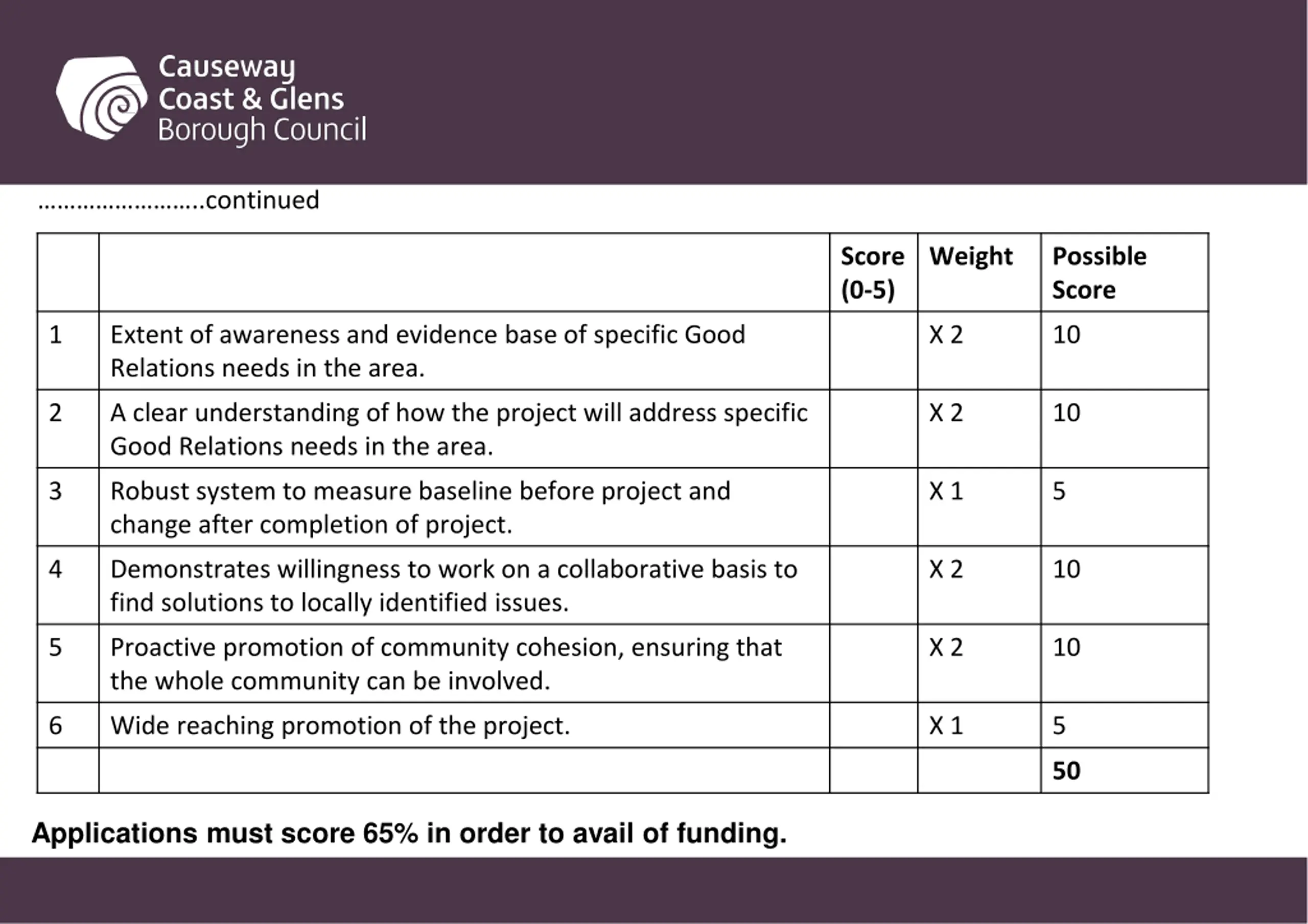 ..continued Score (0-5) Weight Possible Score 1 Extent of awareness and evidence base of specific Good Relations needs in the area. X 2 10 2 A clear understanding of how the project will address specific Good Relations needs in the area. X 2 10 3 Robust system to measure baseline before project and change after completion of project. X 1 5 4 Demonstrates willingness to work on a collaborative basis to find solutions to locally identified issues. X 2 10 5 Proactive promotion of community cohesion, ensuring that the whole community can be involved. X 2 10 6 Wide reaching promotion of the project. X 1 5 50 Applications must score 65% in order to avail of funding.