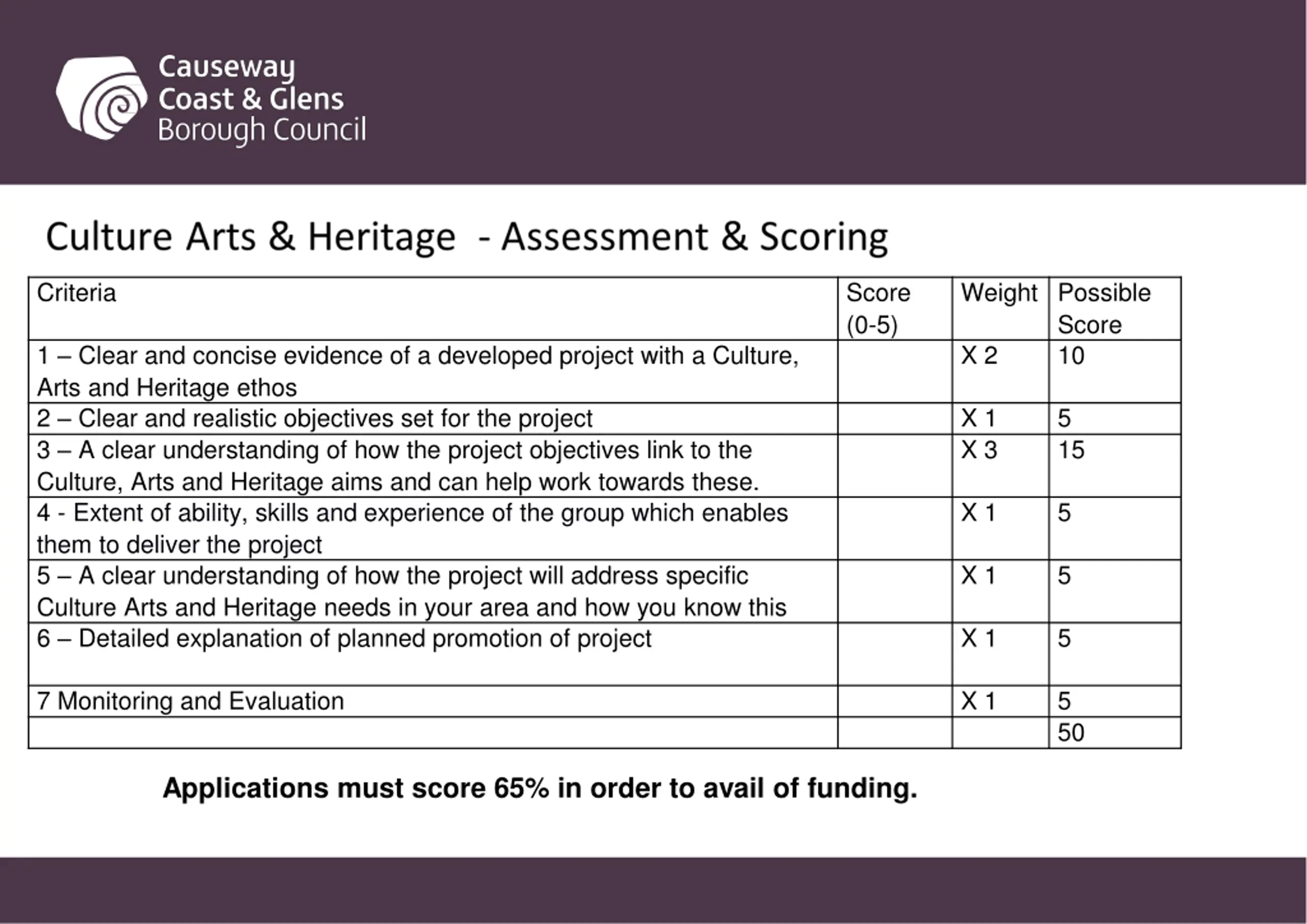 Criteria Score (0-5) Weight Possible Score X 2 10 1 Clear and concise evidence of a developed project with a Culture, Arts and Heritage ethos 2 Clear and realistic objectives set for the project 3 A clear understanding of how the project objectives link to the Culture, Arts and Heritage aims and can help work towards these. 4 - Extent of ability, skills and experience of the group which enables them to deliver the project 5 A clear understanding of how the project will address specific Culture Arts and Heritage needs in your area and how you know this 6 Detailed explanation of planned promotion of project X 1 X 3 5 15 X 1 5 X 1 5 X 1 5 7 Monitoring and Evaluation X 1 5 50 Applications must score 65% in order to avail of funding.