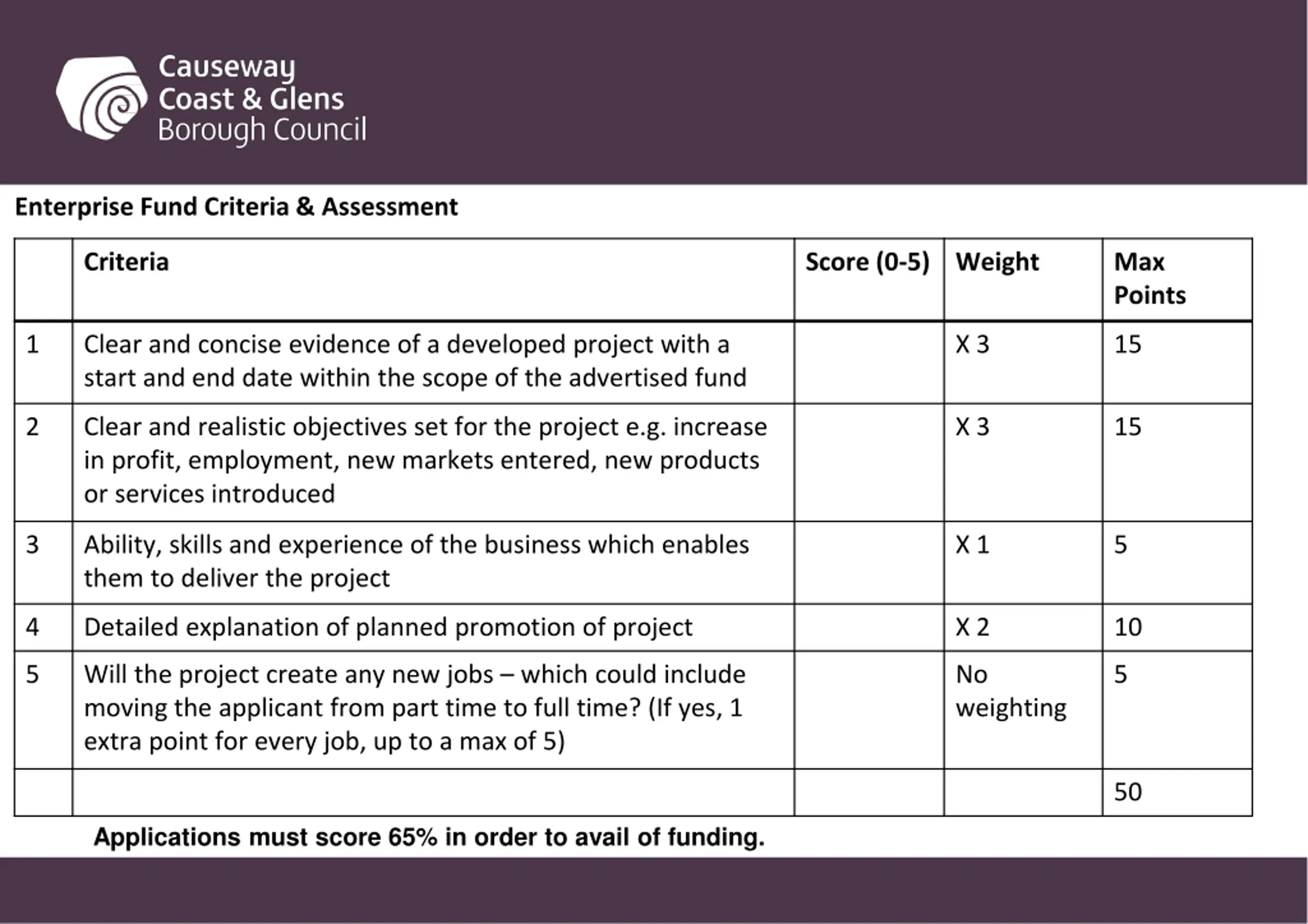 Enterprise Fund Criteria & Assessment Criteria Score (0-5) Weight Max Points 1 Clear and concise evidence of a developed project with a start and end date within the scope of the advertised fund X 3 15 2 Clear and realistic objectives set for the project e.g. increase in profit, employment, new markets entered, new products or services introduced X 3 15 3 Ability, skills and experience of the business which enables them to deliver the project X 1 5 4 Detailed explanation of planned promotion of project X 2 10 5 Will the project create any new jobs which could include moving the applicant from part time to full time? (If yes, 1 extra point for every job, up to a max of 5) No weighting 5 50 Applications must score 65% in order to avail of funding.