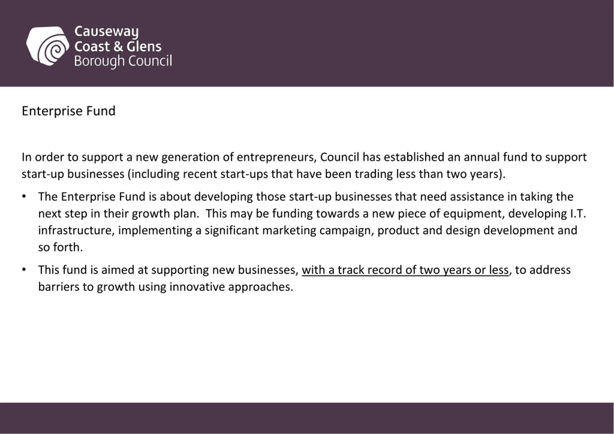 Enterprise Fund In order to support a new generation of entrepreneurs, Council has established an annual fund to support start-up businesses (including recent start-ups that have been trading less than two years). The Enterprise Fund is about developing those start-up businesses that need assistance in taking the next step in their growth plan. This may be funding towards a new piece of equipment, developing I.T. infrastructure, implementing a significant marketing campaign, product and design development and so forth. This fund is aimed at supporting new businesses, with a track record of two years or less, to address barriers to growth using innovative approaches.