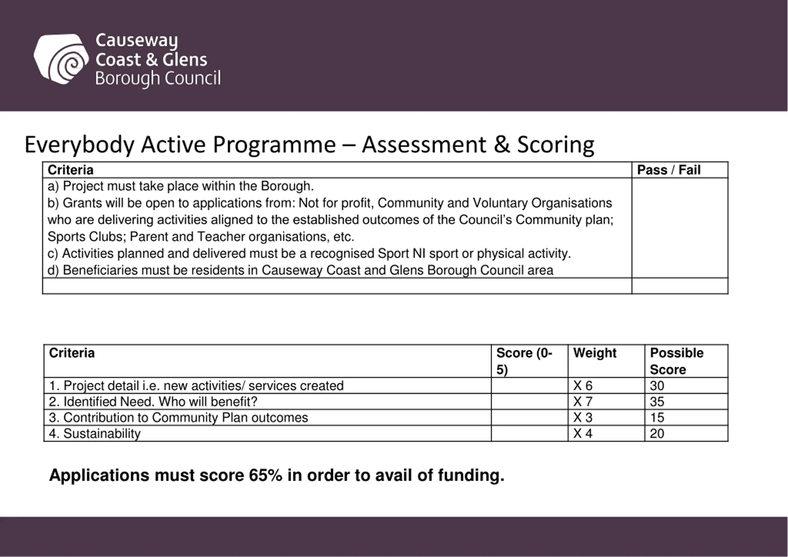 Everybody Active Programme Assessment & Scoring Criteria a) Project must take place within the Borough. b) Grants will be open to applications from: Not for profit, Community and Voluntary Organisations who are delivering activities aligned to the established outcomes of the Council s Community plan; Sports Clubs; Parent and Teacher organisations, etc. c) Activities planned and delivered must be a recognised Sport NI sport or physical activity. d) Beneficiaries must be residents in Causeway Coast and Glens Borough Council area Pass / Fail Criteria Score (0- 5) Weight Possible Score 30 35 15 20 1. Project detail i.e. new activities/ services created 2. Identified Need. Who will benefit? 3. Contribution to Community Plan outcomes 4. Sustainability X 6 X 7 X 3 X 4 Applications must score 65% in order to avail of funding.