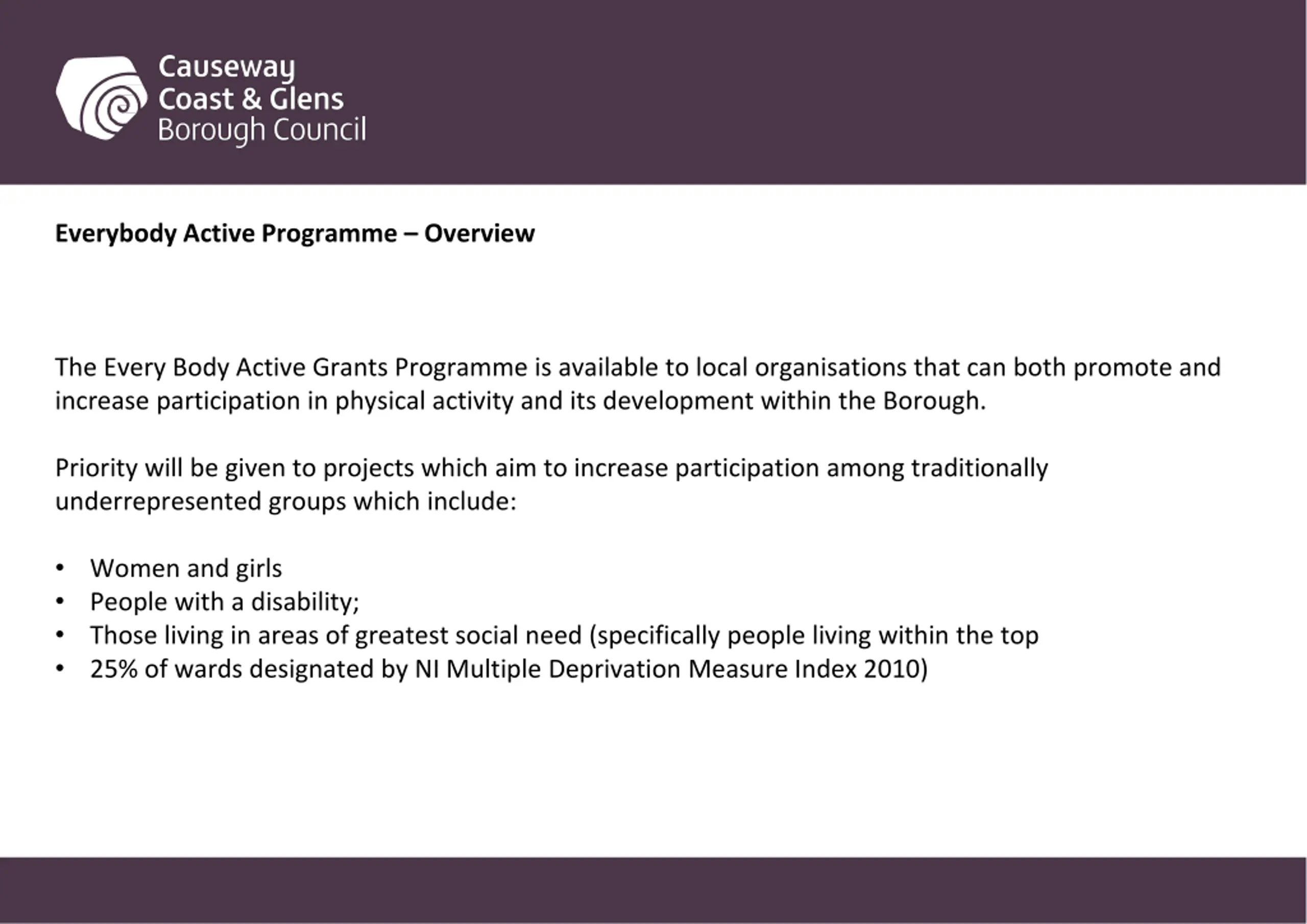 Everybody Active Programme Overview The Every Body Active Grants Programme is available to local organisations that can both promote and increase participation in physical activity and its development within the Borough. Priority will be given to projects which aim to increase participation among traditionally underrepresented groups which include: Women and girls People with a disability; Those living in areas of greatest social need (specifically people living within the top 25% of wards designated by NI Multiple Deprivation Measure Index 2010)
