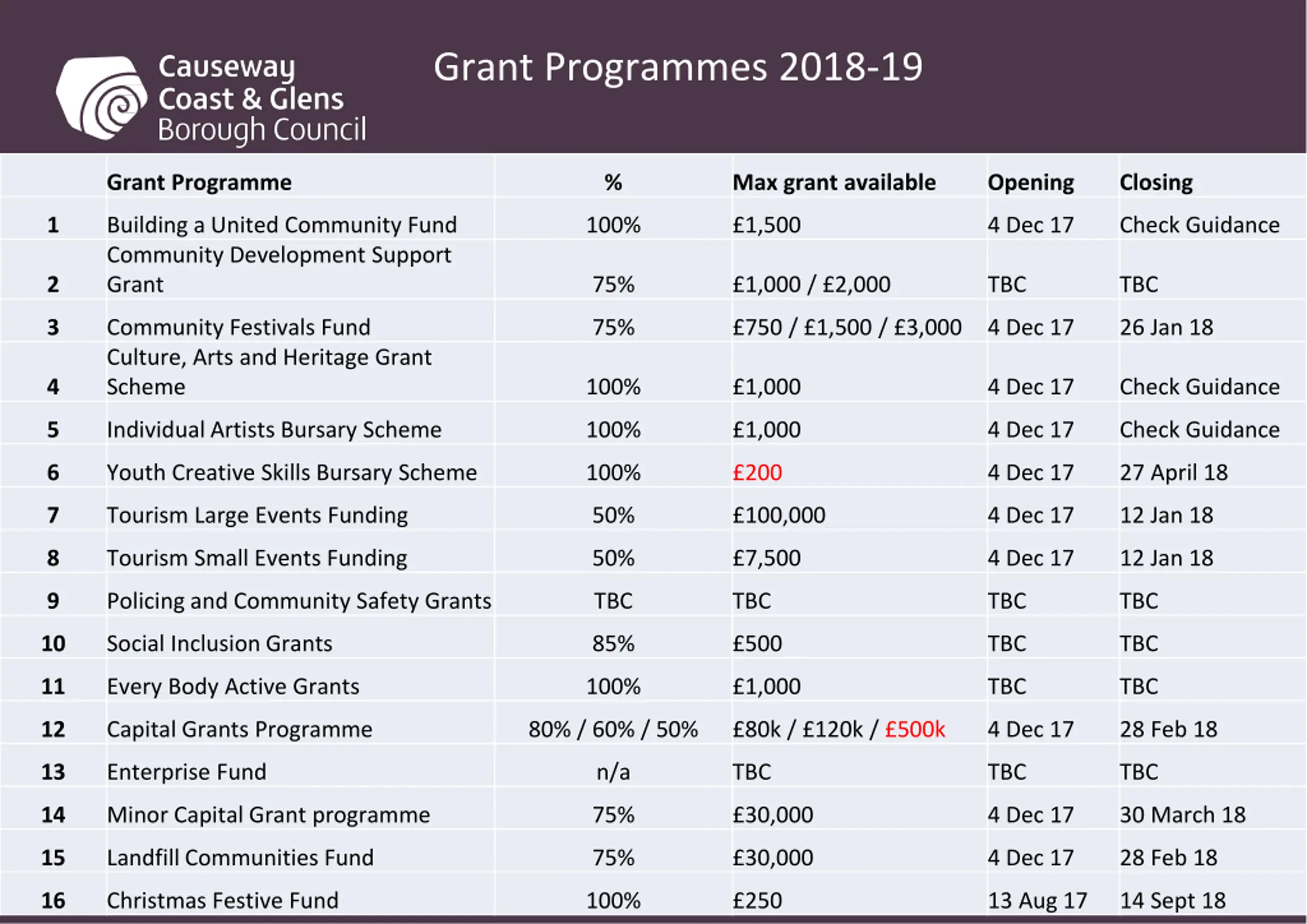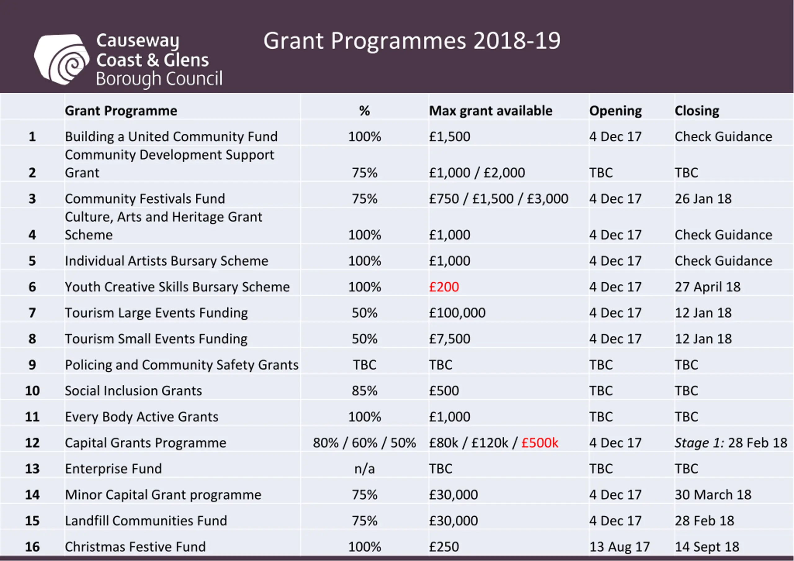 Causeway Coast and Glens Borough Council Funding Roadshows for 2018 2019 Grant Programmes 2.00pm, 4thDecember, Large Committee Room, Cloonavin, Coleraine 7.00pm, 4thDecember, Meeting Room. Joey Dunlop Centre, Ballymoney 2.00pm, 5thDecember, O Hampsey Studio, Roe Valley Arts Centre, Limavady 7.00pm, 5thDecember, Mayor s Parlour, Sheskburn House, Ballycastle