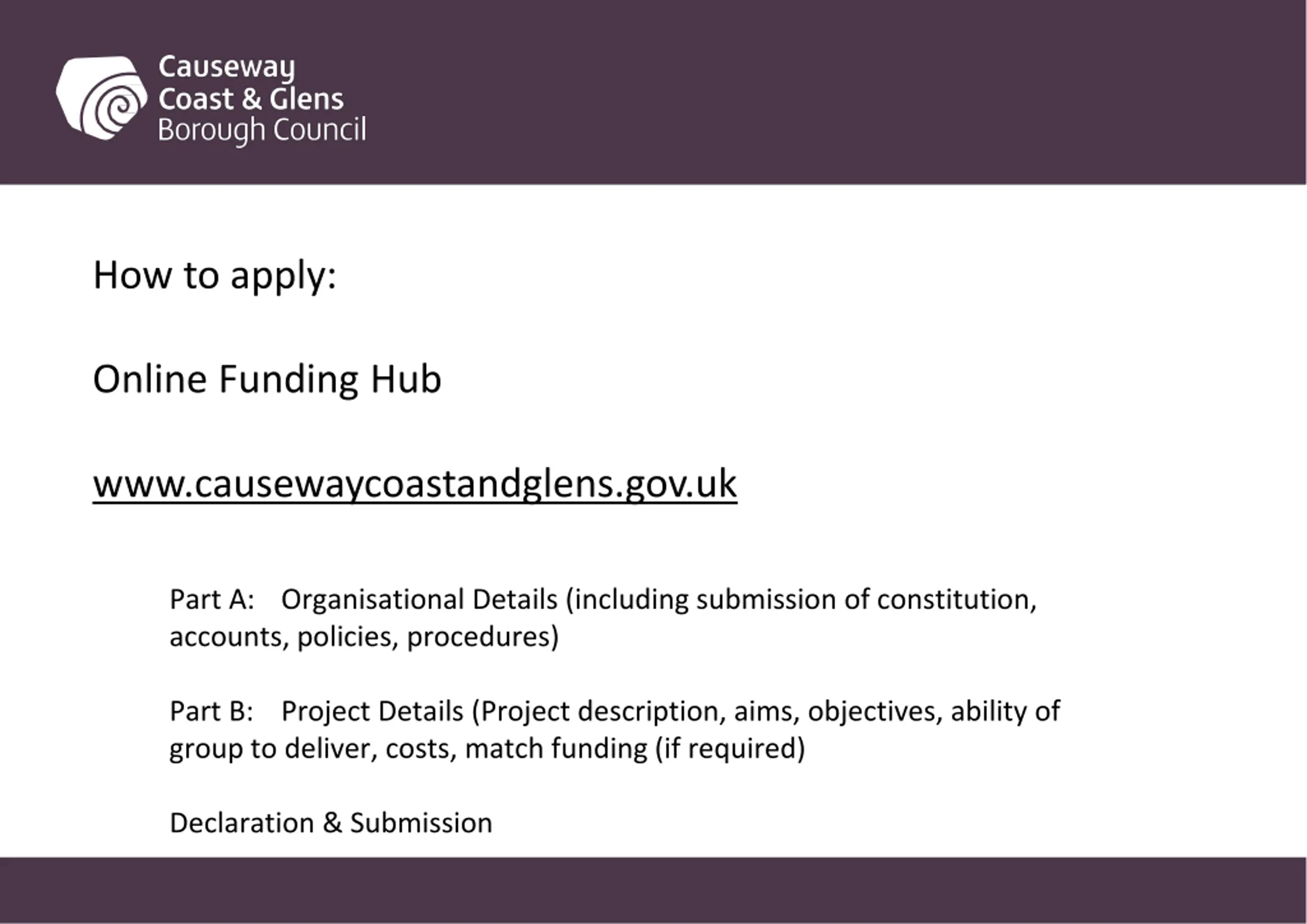 How to apply: Online Funding Hub www.causewaycoastandglens.gov.uk Part A: Organisational Details (including submission of constitution, accounts, policies, procedures) Part B: Project Details (Project description, aims, objectives, ability of group to deliver, costs, match funding (if required) Declaration & Submission