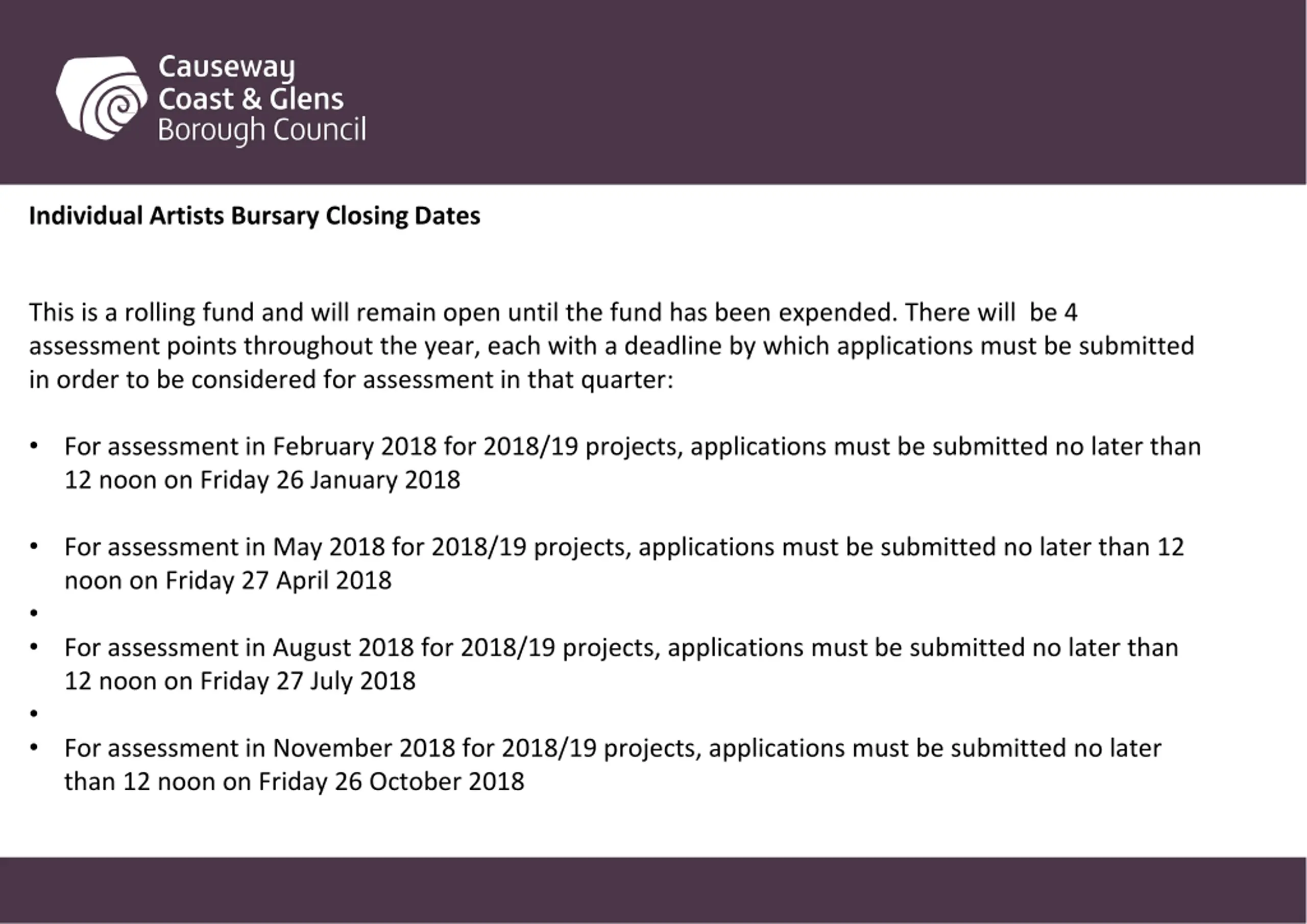 Individual Artists Bursary Closing Dates This is a rolling fund and will remain open until the fund has been expended. There will be 4 assessment points throughout the year, each with a deadline by which applications must be submitted in order to be considered for assessment in that quarter: For assessment in February 2018 for 2018/19 projects, applications must be submitted no later than 12 noon on Friday 26 January 2018 For assessment in May 2018 for 2018/19 projects, applications must be submitted no later than 12 noon on Friday 27 April 2018 For assessment in August 2018 for 2018/19 projects, applications must be submitted no later than 12 noon on Friday 27 July 2018 For assessment in November 2018 for 2018/19 projects, applications must be submitted no later than 12 noon on Friday 26 October 2018