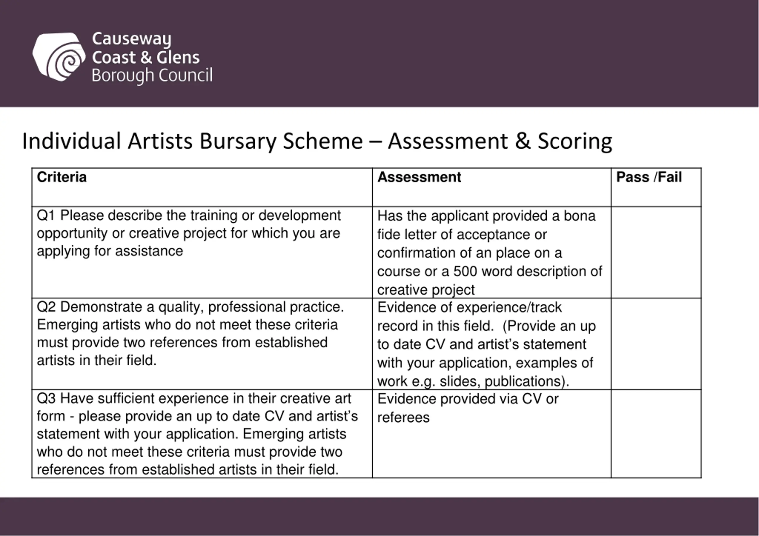Individual Artists Bursary Scheme Assessment & Scoring Criteria Assessment Pass /Fail Q1 Please describe the training or development opportunity or creative project for which you are applying for assistance Has the applicant provided a bona fide letter of acceptance or confirmation of an place on a course or a 500 word description of creative project Evidence of experience/track record in this field. (Provide an up to date CV and artist s statement with your application, examples of work e.g. slides, publications). Evidence provided via CV or referees Q2 Demonstrate a quality, professional practice. Emerging artists who do not meet these criteria must provide two references from established artists in their field. Q3 Have sufficient experience in their creative art form - please provide an up to date CV and artist s statement with your application. Emerging artists who do not meet these criteria must provide two references from established artists in their field.