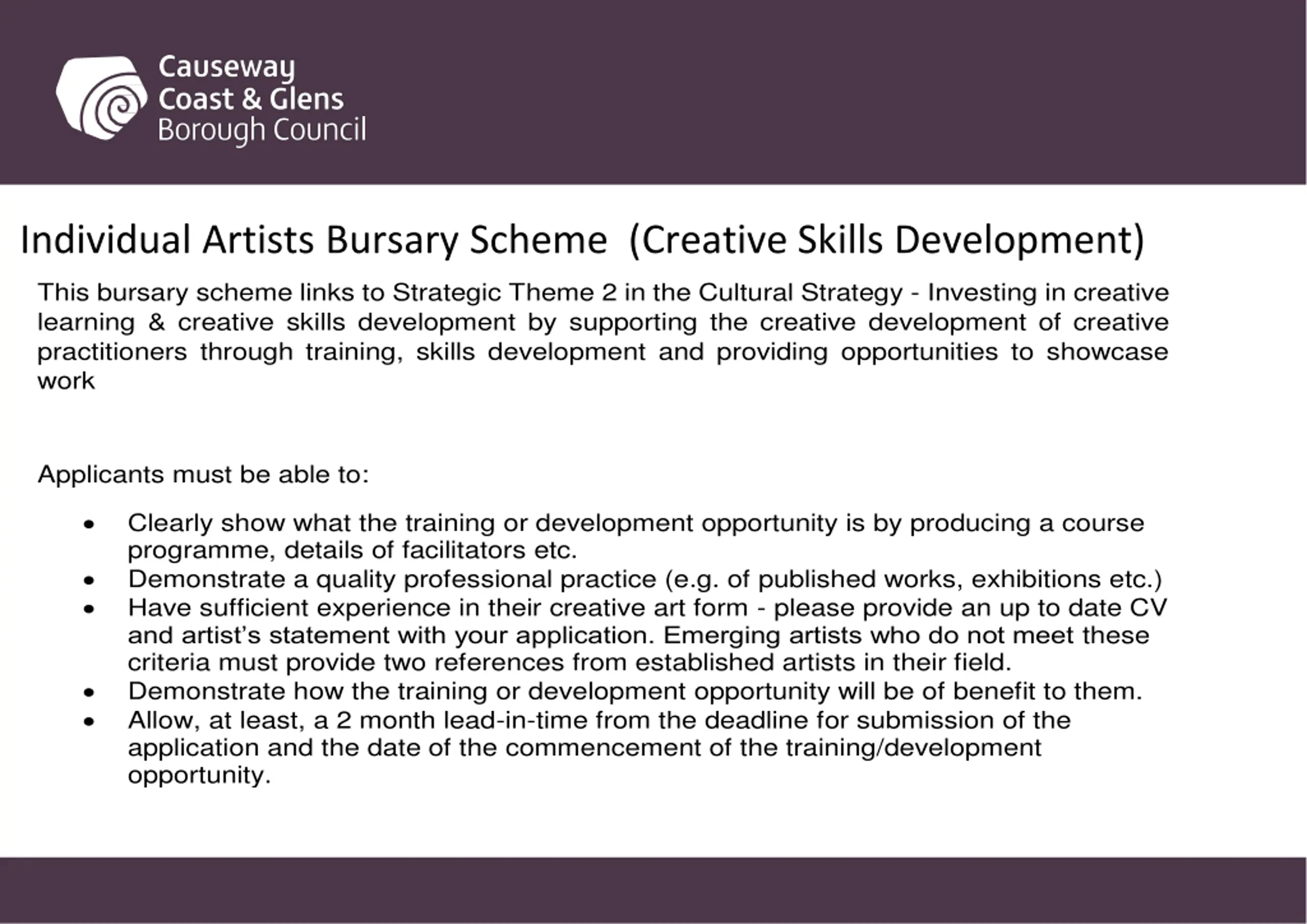 Individual Artists Bursary Scheme (Creative Skills Development) This bursary scheme links to Strategic Theme 2 in the Cultural Strategy - Investing in creative learning & creative skills development by supporting the creative development of creative practitioners through training, skills development and providing opportunities to showcase work Applicants must be able to: Clearly show what the training or development opportunity is by producing a course programme, details of facilitators etc. Demonstrate a quality professional practice (e.g. of published works, exhibitions etc.) Have sufficient experience in their creative art form - please provide an up to date CV and artist s statement with your application. Emerging artists who do not meet these criteria must provide two references from established artists in their field. Demonstrate how the training or development opportunity will be of benefit to them. Allow, at least, a 2 month lead-in-time from the deadline for submission of the application and the date of the commencement of the training/development opportunity.