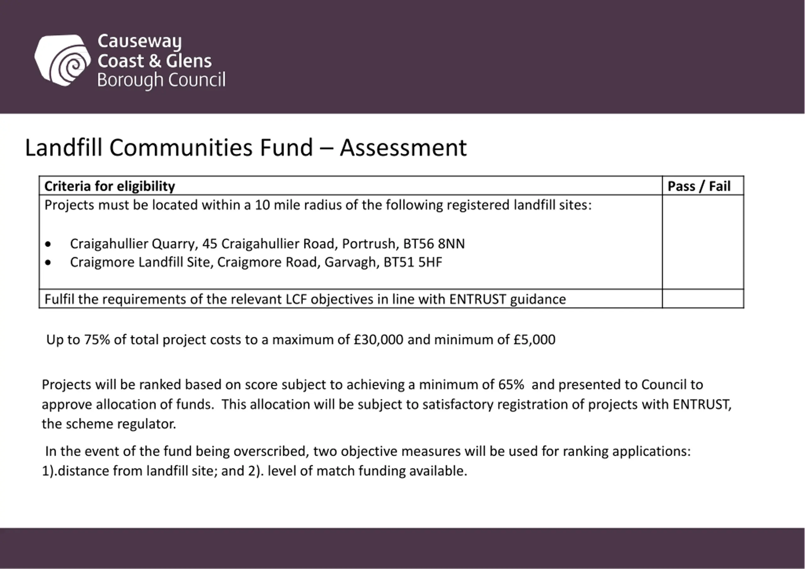 Landfill Communities Fund Assessment Criteria for eligibility Projects must be located within a 10 mile radius of the following registered landfill sites: Pass / Fail Craigahullier Quarry, 45 Craigahullier Road, Portrush, BT56 8NN Craigmore Landfill Site, Craigmore Road, Garvagh, BT51 5HF Fulfil the requirements of the relevant LCF objectives in line with ENTRUST guidance Up to 75% of total project costs to a maximum of 30,000 and minimum of 5,000 Projects will be ranked based on score subject to achieving a minimum of 65% and presented to Council to approve allocation of funds. This allocation will be subject to satisfactory registration of projects with ENTRUST, the scheme regulator. In the event of the fund being overscribed, two objective measures will be used for ranking applications: 1).distance from landfill site; and 2). level of match funding available.