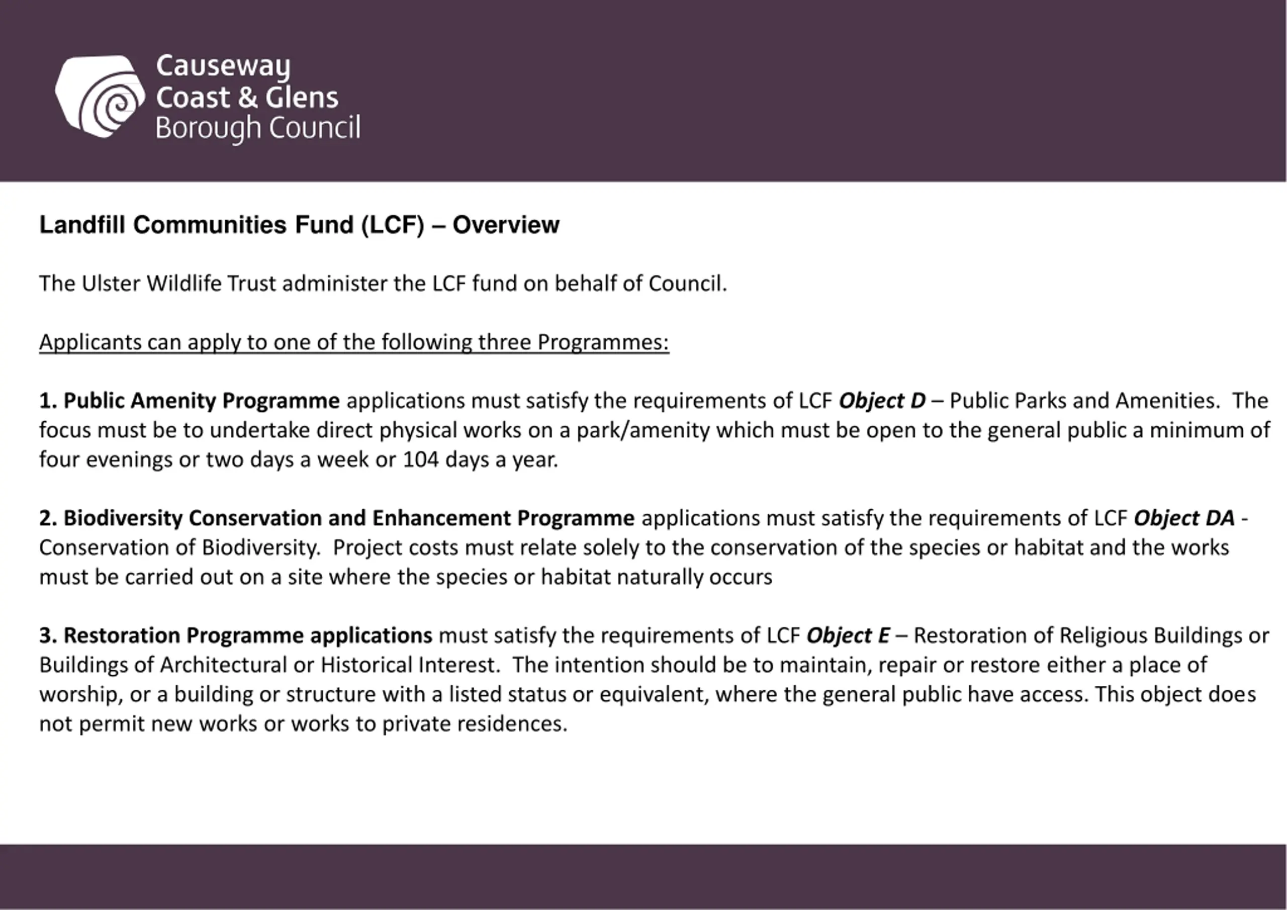Landfill Communities Fund (LCF) Overview The Ulster Wildlife Trust administer the LCF fund on behalf of Council. Applicants can apply to one of the following three Programmes: 1. Public Amenity Programme applications must satisfy the requirements of LCF Object D Public Parks and Amenities. The focus must be to undertake direct physical works on a park/amenity which must be open to the general public a minimum of four evenings or two days a week or 104 days a year. 2. Biodiversity Conservation and Enhancement Programme applications must satisfy the requirements of LCF Object DA - Conservation of Biodiversity. Project costs must relate solely to the conservation of the species or habitat and the works must be carried out on a site where the species or habitat naturally occurs 3. Restoration Programme applications must satisfy the requirements of LCF Object E Restoration of Religious Buildings or Buildings of Architectural or Historical Interest. The intention should be to maintain, repair or restore either a place of worship, or a building or structure with a listed status or equivalent, where the general public have access. This object does not permit new works or works to private residences.