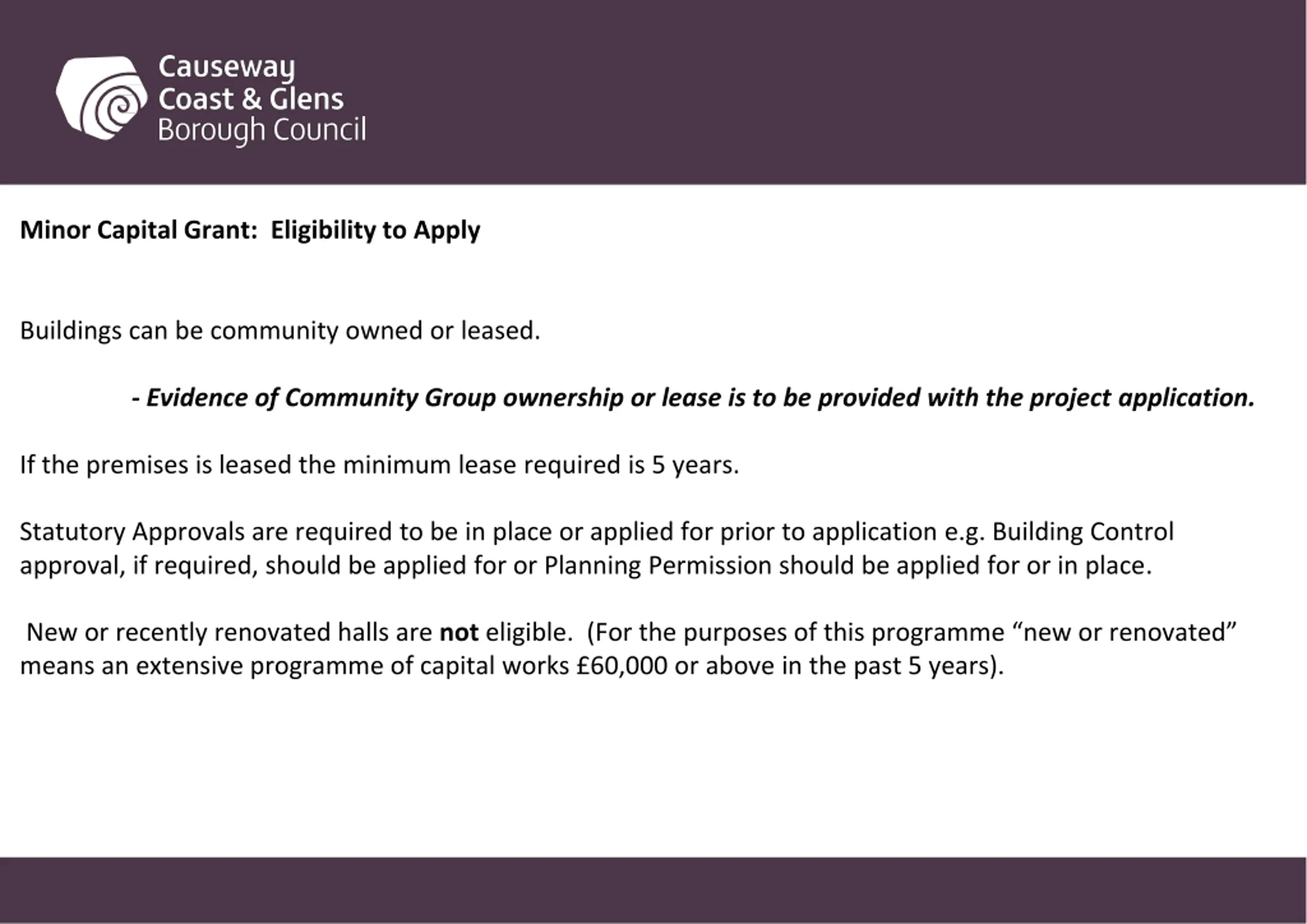 Minor Capital Grant: Eligibility to Apply Buildings can be community owned or leased. - Evidence of Community Group ownership or lease is to be provided with the project application. If the premises is leased the minimum lease required is 5 years. Statutory Approvals are required to be in place or applied for prior to application e.g. Building Control approval, if required, should be applied for or Planning Permission should be applied for or in place. New or recently renovated halls are noteligible. (For the purposes of this programme new or renovated means an extensive programme of capital works 60,000 or above in the past 5 years).