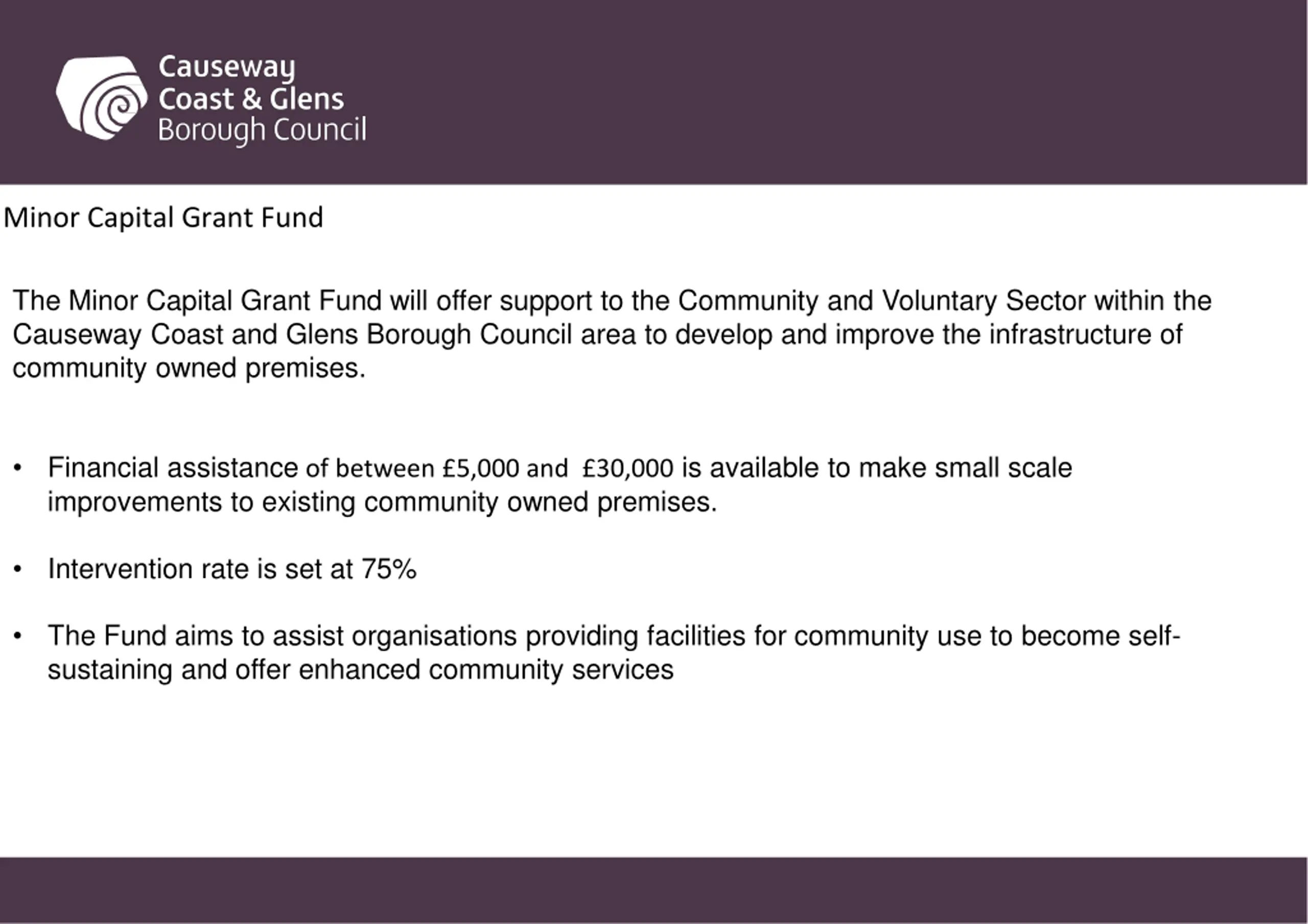 Minor Capital Grant Fund The Minor Capital Grant Fund will offer support to the Community and Voluntary Sector within the Causeway Coast and Glens Borough Council area to develop and improve the infrastructure of community owned premises. Financial assistance of between 5,000 and 30,000 is available to make small scale improvements to existing community owned premises. Intervention rate is set at 75% The Fund aims to assist organisations providing facilities for community use to become self- sustaining and offer enhanced community services