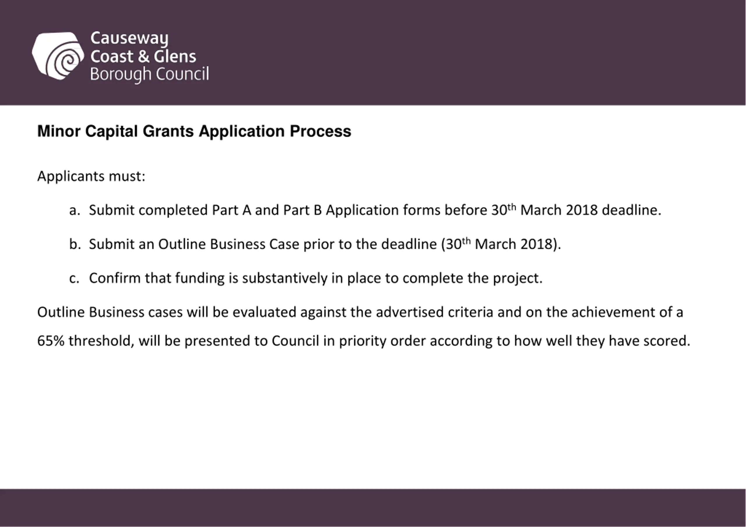 Minor Capital Grants Application Process Applicants must: a. Submit completed Part A and Part B Application forms before 30th March 2018 deadline. b. Submit an Outline Business Case prior to the deadline (30th March 2018). c. Confirm that funding is substantively in place to complete the project. Outline Business cases will be evaluated against the advertised criteria and on the achievement of a 65% threshold, will be presented to Council in priority order according to how well they have scored.