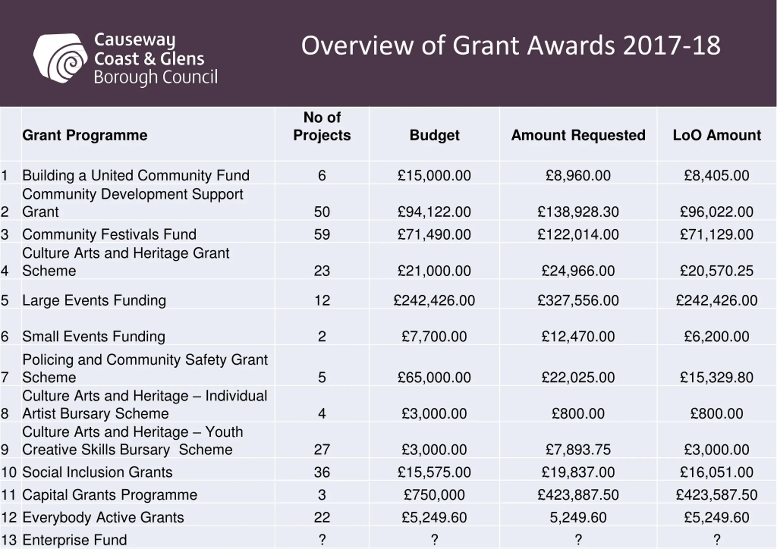 Overview of Grant Awards 2017-18 No of Projects Grant Programme Budget Amount Requested LoO Amount Grant Programmes 2016 -17 1 Building a United Community Fund Community Development Support Grant Community Festivals Fund Culture Arts and Heritage Grant Scheme 6 15,000.00 8,960.00 8,405.00 2 3 50 59 94,122.00 71,490.00 138,928.30 122,014.00 96,022.00 71,129.00 4 23 21,000.00 24,966.00 20,570.25 5 Large Events Funding 12 242,426.00 327,556.00 242,426.00 6 Small Events Funding Policing and Community Safety Grant Scheme Culture Arts and Heritage Individual Artist Bursary Scheme Culture Arts and Heritage Youth Creative Skills Bursary Scheme 10 Social Inclusion Grants 11 Capital Grants Programme 12 Everybody Active Grants 13 Enterprise Fund 2 7,700.00 12,470.00 6,200.00 7 5 65,000.00 22,025.00 15,329.80 8 4 3,000.00 800.00 800.00 9 27 36 3 22 ? 3,000.00 15,575.00 750,000 5,249.60 ? 7,893.75 19,837.00 423,887.50 5,249.60 ? 3,000.00 16,051.00 423,587.50 5,249.60 ?