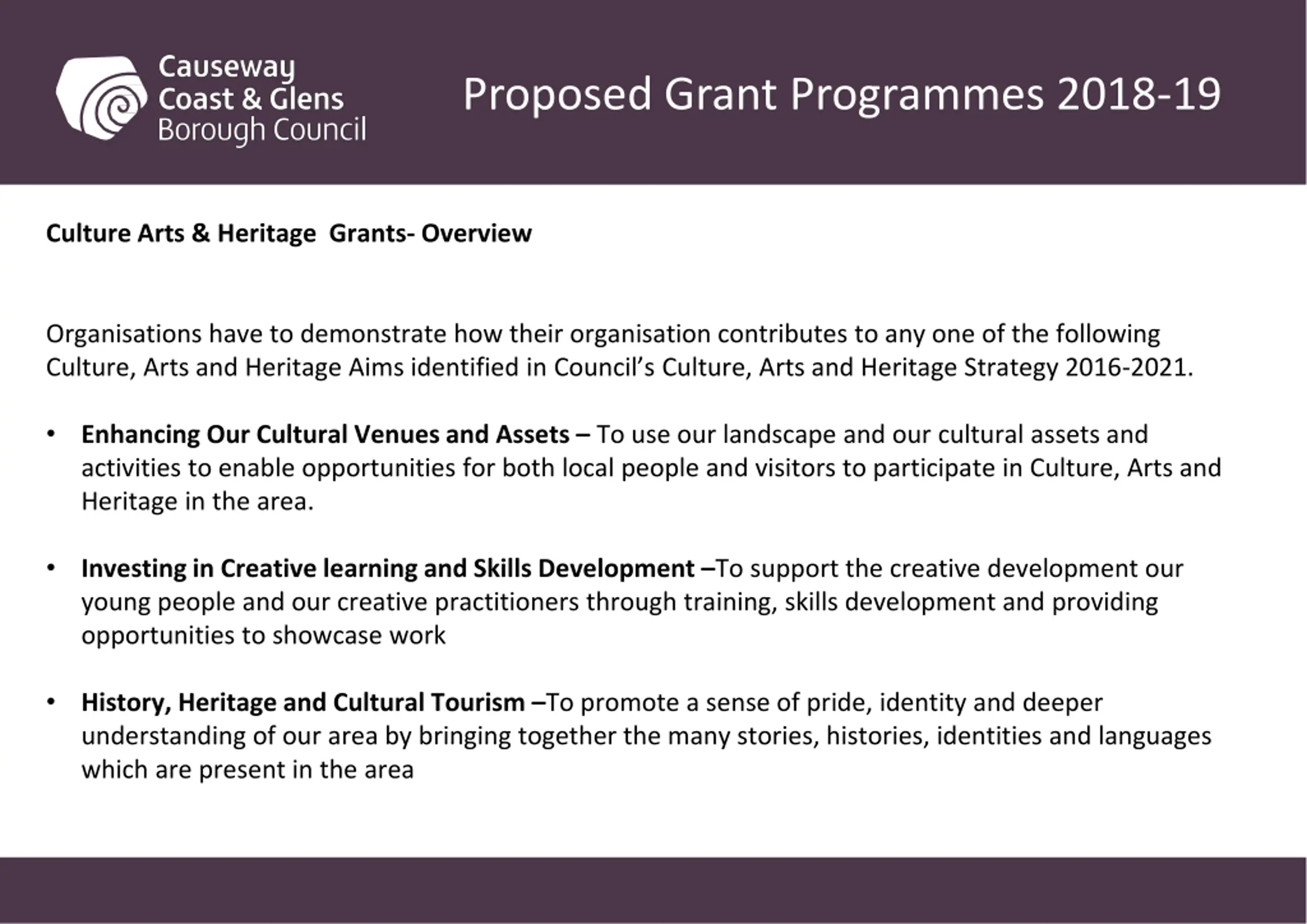 Proposed Grant Programmes 2018-19 Culture Arts & Heritage Grants- Overview Organisations have to demonstrate how their organisation contributes to any one of the following Culture, Arts and Heritage Aims identified in Council s Culture, Arts and Heritage Strategy 2016-2021. Enhancing Our Cultural Venues and Assets To use our landscape and our cultural assets and activities to enable opportunities for both local people and visitors to participate in Culture, Arts and Heritage in the area. Investing in Creative learning and Skills Development To support the creative development our young people and our creative practitioners through training, skills development and providing opportunities to showcase work History, Heritage and Cultural Tourism To promote a sense of pride, identity and deeper understanding of our area by bringing together the many stories, histories, identities and languages which are present in the area