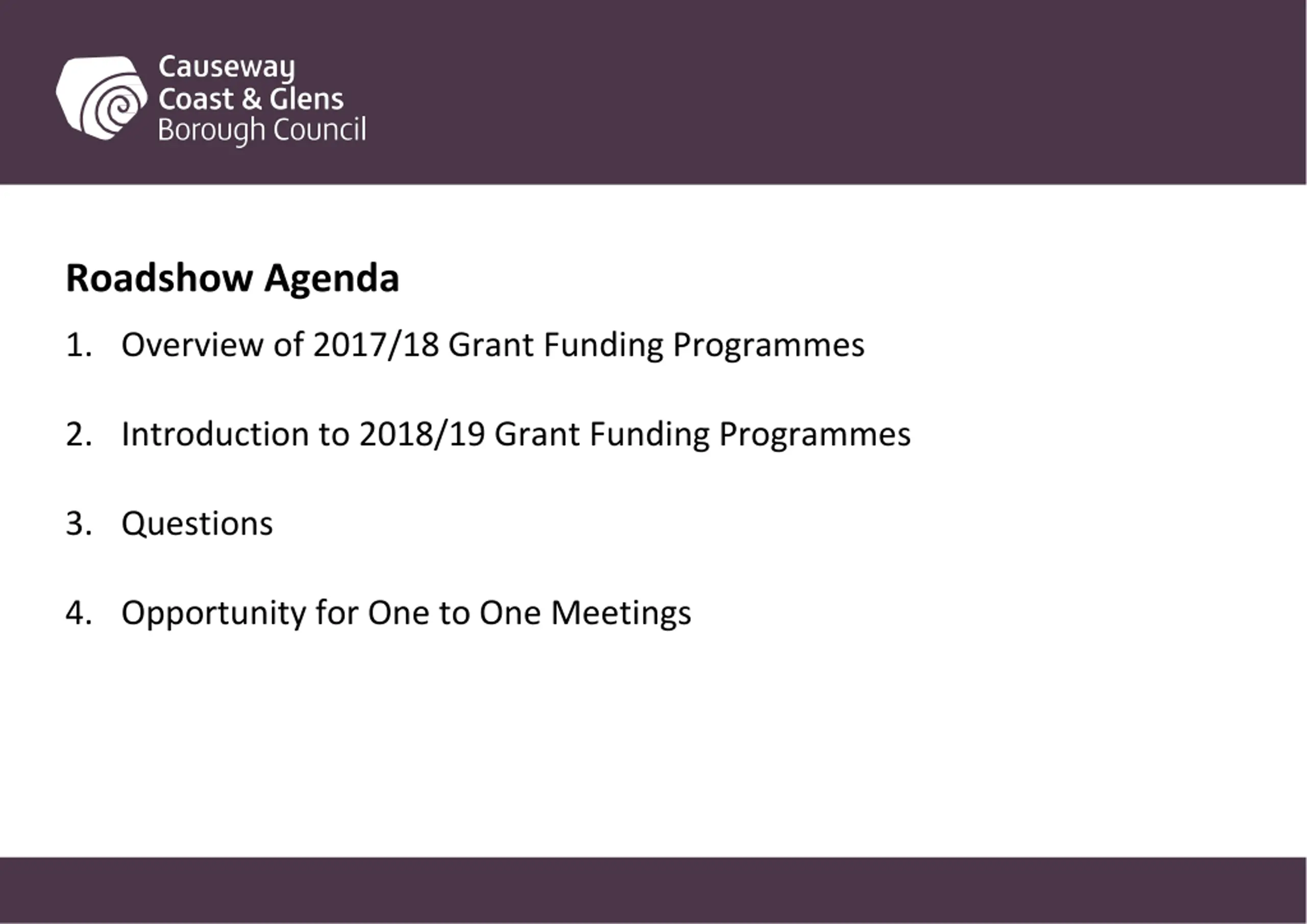 Roadshow Agenda 1. Overview of 2017/18 Grant Funding Programmes 2. Introduction to 2018/19 Grant Funding Programmes 3. Questions 4. Opportunity for One to One Meetings