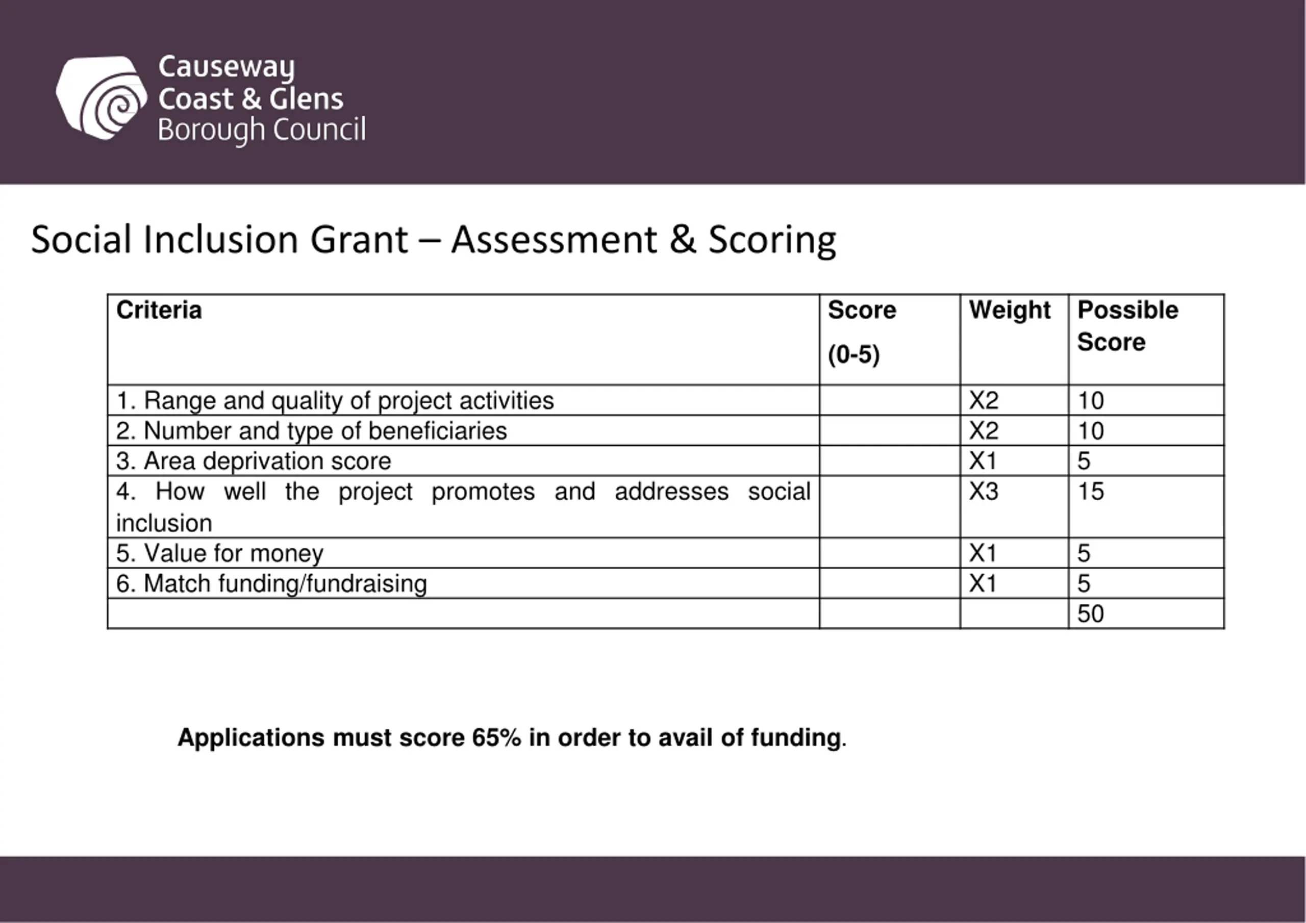 Social Inclusion Grant Assessment & Scoring Criteria Score Weight Possible Score (0-5) 1. Range and quality of project activities 2. Number and type of beneficiaries 3. Area deprivation score 4. How well the project promotes and addresses social inclusion 5. Value for money 6. Match funding/fundraising X2 X2 X1 X3 10 10 5 15 X1 X1 5 5 50 Applications must score 65% in order to avail of funding.