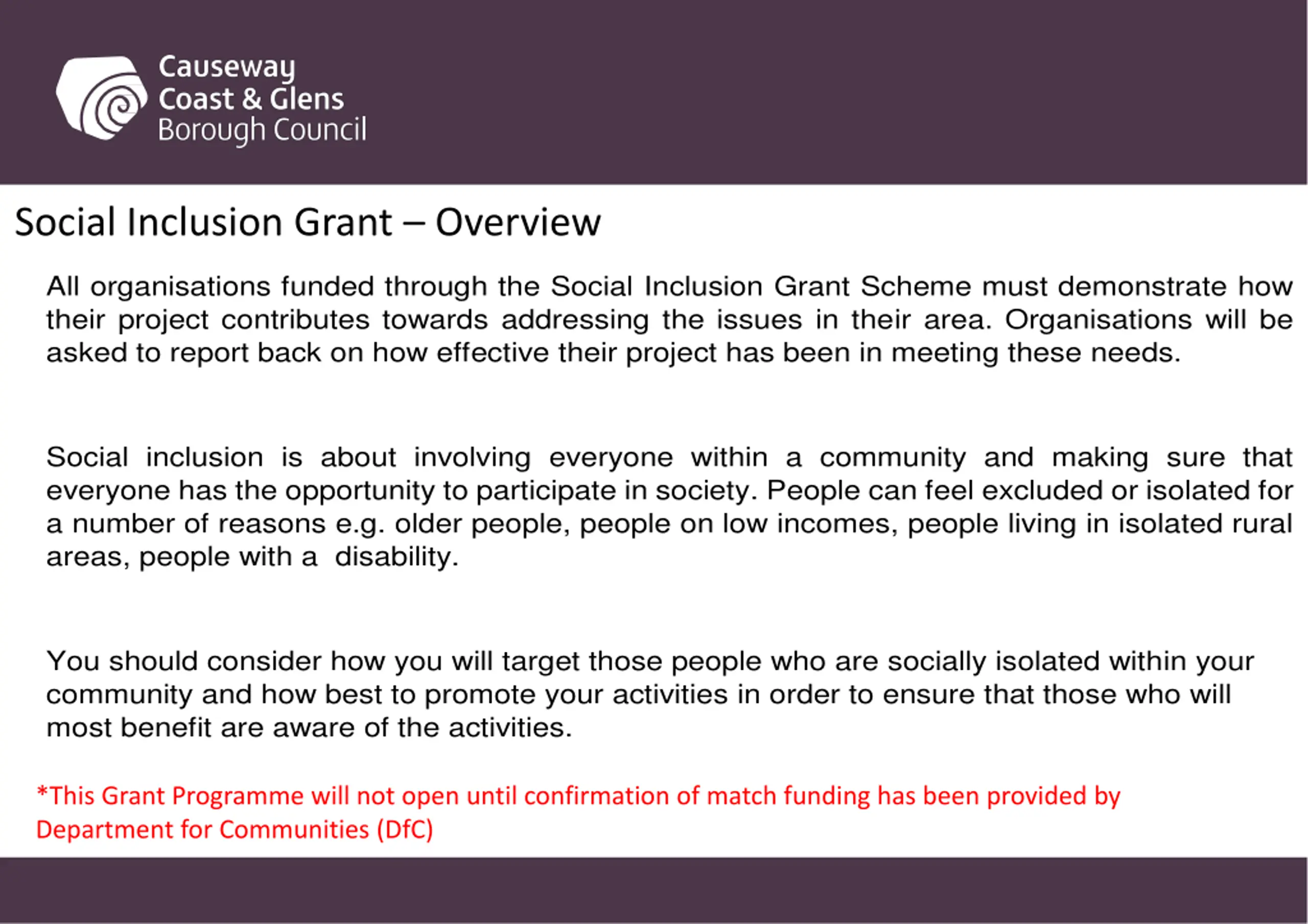 Social Inclusion Grant Overview All organisations funded through the Social Inclusion Grant Scheme must demonstrate how their project contributes towards addressing the issues in their area. Organisations will be asked to report back on how effective their project has been in meeting these needs. Social inclusion is about involving everyone within a community and making sure that everyone has the opportunity to participate in society. People can feel excluded or isolated for a number of reasons e.g. older people, people on low incomes, people living in isolated rural areas, people with a disability. You should consider how you will target those people who are socially isolated within your community and how best to promote your activities in order to ensure that those who will most benefit are aware of the activities. *This Grant Programme will not open until confirmation of match funding has been provided by Department for Communities (DfC)