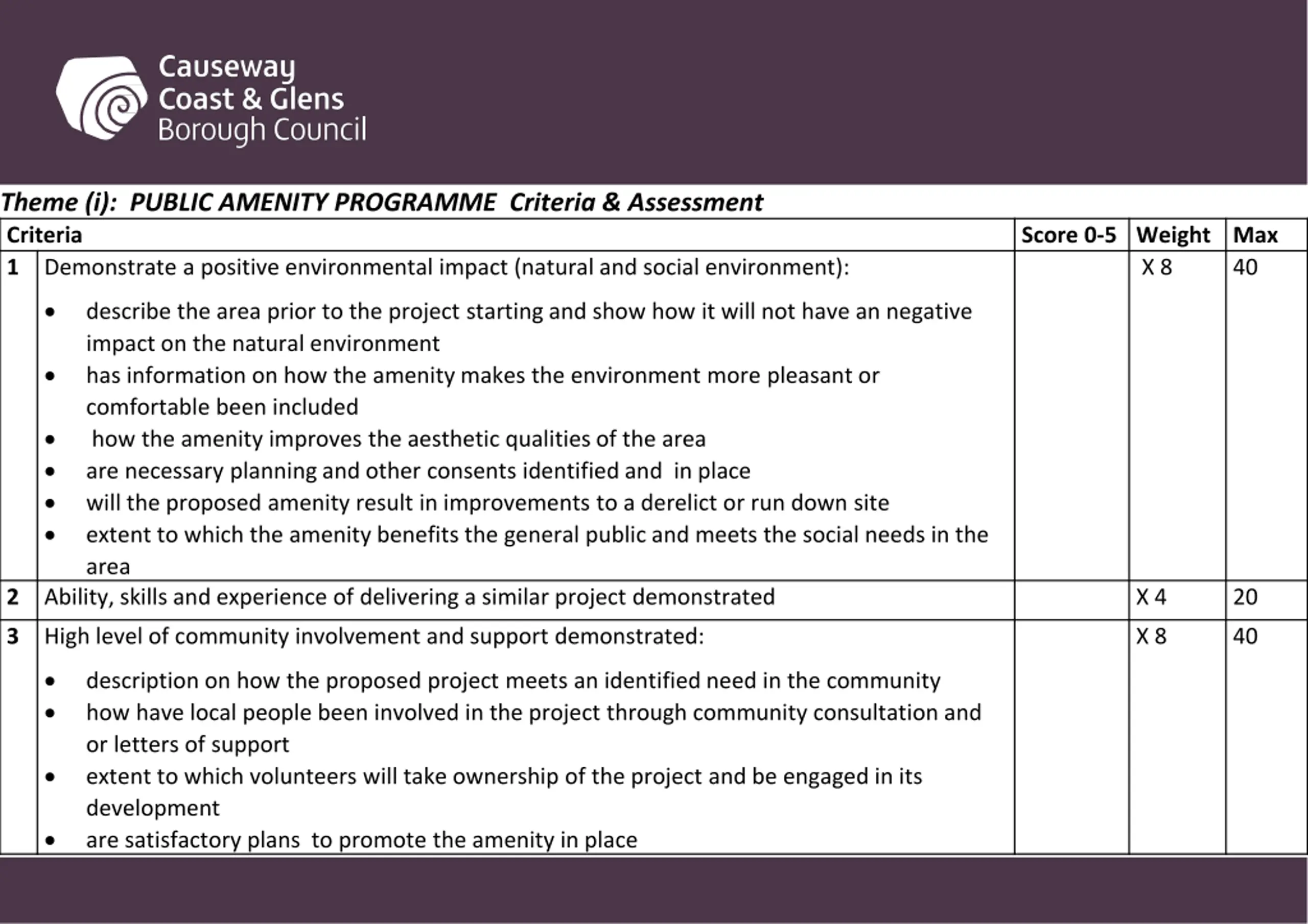 Theme (i): PUBLIC AMENITY PROGRAMME Criteria & Assessment Criteria 1 Demonstrate a positive environmental impact (natural and social environment): Score 0-5 Weight Max X 8 40 describe the area prior to the project starting and show how it will not have an negative impact on the natural environment has information on how the amenity makes the environment more pleasant or comfortable been included how the amenity improves the aesthetic qualities of the area are necessary planning and other consents identified and in place will the proposed amenity result in improvements to a derelict or run down site extent to which the amenity benefits the general public and meets the social needs in the area Ability, skills and experience of delivering a similar project demonstrated 2 X 4 20 3 High level of community involvement and support demonstrated: X 8 40 description on how the proposed project meets an identified need in the community how have local people been involved in the project through community consultation and or letters of support extent to which volunteers will take ownership of the project and be engaged in its development are satisfactory plans to promote the amenity in place