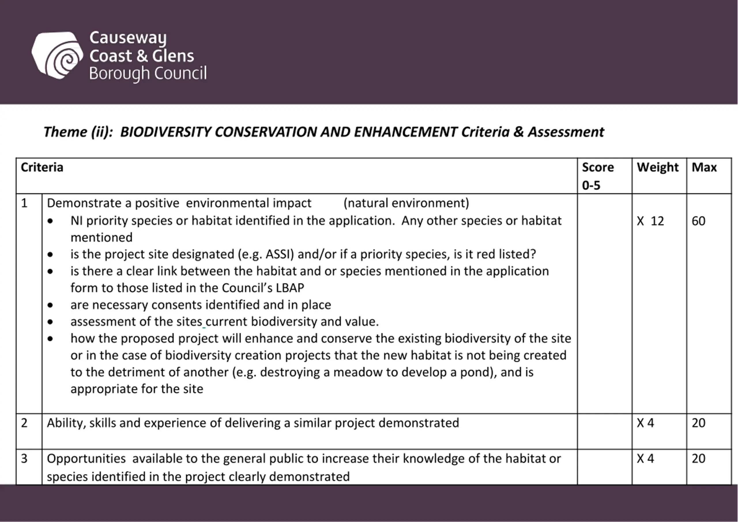 Theme (ii): BIODIVERSITY CONSERVATION AND ENHANCEMENT Criteria & Assessment Criteria Score 0-5 Weight Max 1 Demonstrate a positive environmental impact (natural environment) NI priority species or habitat identified in the application. Any other species or habitat mentioned is the project site designated (e.g. ASSI) and/or if a priority species, is it red listed? is there a clear link between the habitat and or species mentioned in the application form to those listed in the Council s LBAP are necessary consents identified and in place assessment of the sites current biodiversity and value. how the proposed project will enhance and conserve the existing biodiversity of the site or in the case of biodiversity creation projects that the new habitat is not being created to the detriment of another (e.g. destroying a meadow to develop a pond), and is appropriate for the site X 12 60 2 Ability, skills and experience of delivering a similar project demonstrated X 4 20 3 Opportunities available to the general public to increase their knowledge of the habitat or species identified in the project clearly demonstrated X 4 20