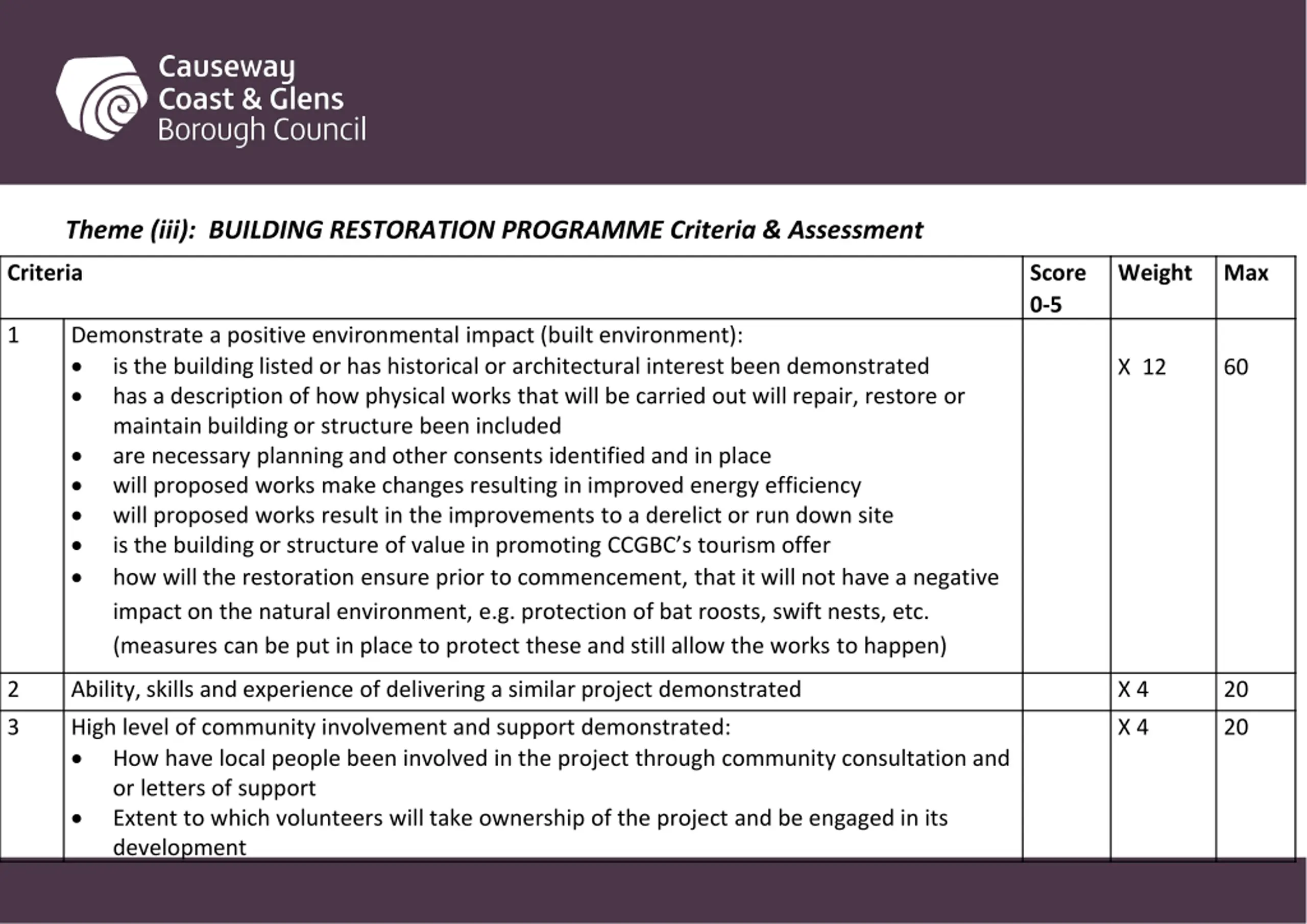 Theme (iii): BUILDING RESTORATION PROGRAMME Criteria & Assessment Criteria Score 0-5 Weight Max 1 Demonstrate a positive environmental impact (built environment): is the building listed or has historical or architectural interest been demonstrated has a description of how physical works that will be carried out will repair, restore or maintain building or structure been included are necessary planning and other consents identified and in place will proposed works make changes resulting in improved energy efficiency will proposed works result in the improvements to a derelict or run down site is the building or structure of value in promoting CCGBC s tourism offer how will the restoration ensure prior to commencement, that it will not have a negative impact on the natural environment, e.g. protection of bat roosts, swift nests, etc. (measures can be put in place to protect these and still allow the works to happen) X 12 60 2 Ability, skills and experience of delivering a similar project demonstrated X 4 20 3 High level of community involvement and support demonstrated: How have local people been involved in the project through community consultation and or letters of support Extent to which volunteers will take ownership of the project and be engaged in its development X 4 20