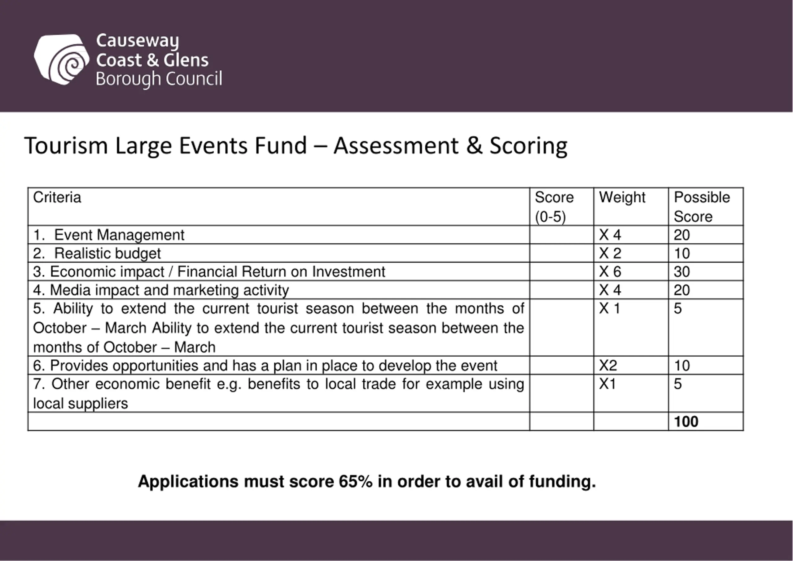 Tourism Large Events Fund Assessment & Scoring Criteria Score (0-5) Weight Possible Score 20 10 30 20 5 1. Event Management 2. Realistic budget 3. Economic impact / Financial Return on Investment 4. Media impact and marketing activity 5. Ability to extend the current tourist season between the months of October March Ability to extend the current tourist season between the months of October March 6. Provides opportunities and has a plan in place to develop the event 7. Other economic benefit e.g. benefits to local trade for example using local suppliers X 4 X 2 X 6 X 4 X 1 X2 X1 10 5 100 Applications must score 65% in order to avail of funding.