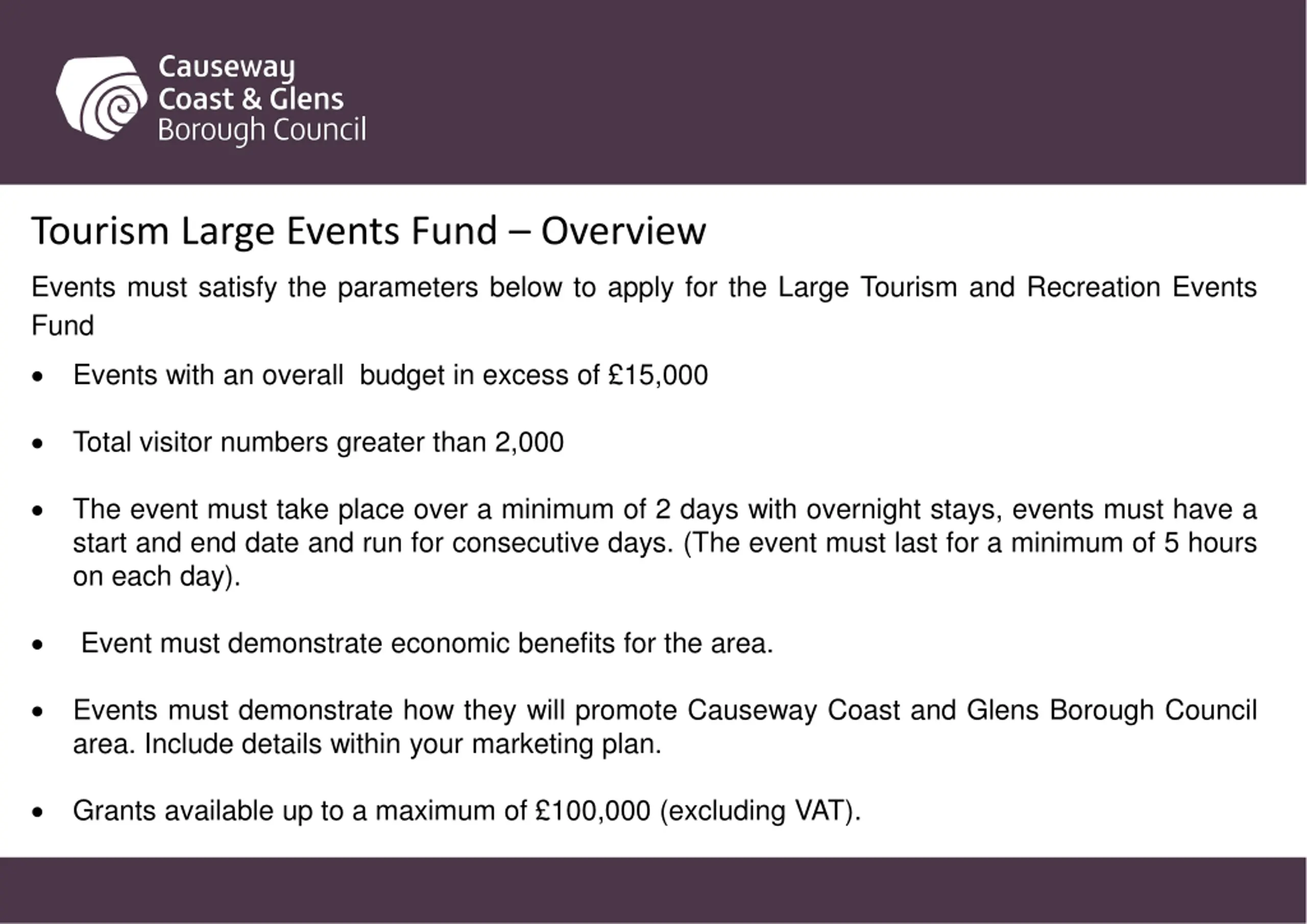 Tourism Large Events Fund Overview Events must satisfy the parameters below to apply for theLarge Tourism and Recreation Events Fund Events with an overall budget in excess of 15,000 Total visitor numbers greater than 2,000 The event must take place over a minimum of 2 days with overnight stays, events must have a start and end date and run for consecutive days. (The event must last for a minimum of 5 hours on each day). Event must demonstrate economic benefits for the area. Events must demonstrate how they will promote Causeway Coast and Glens Borough Council area. Include details within your marketing plan. Grants available up to a maximum of 100,000 (excluding VAT).
