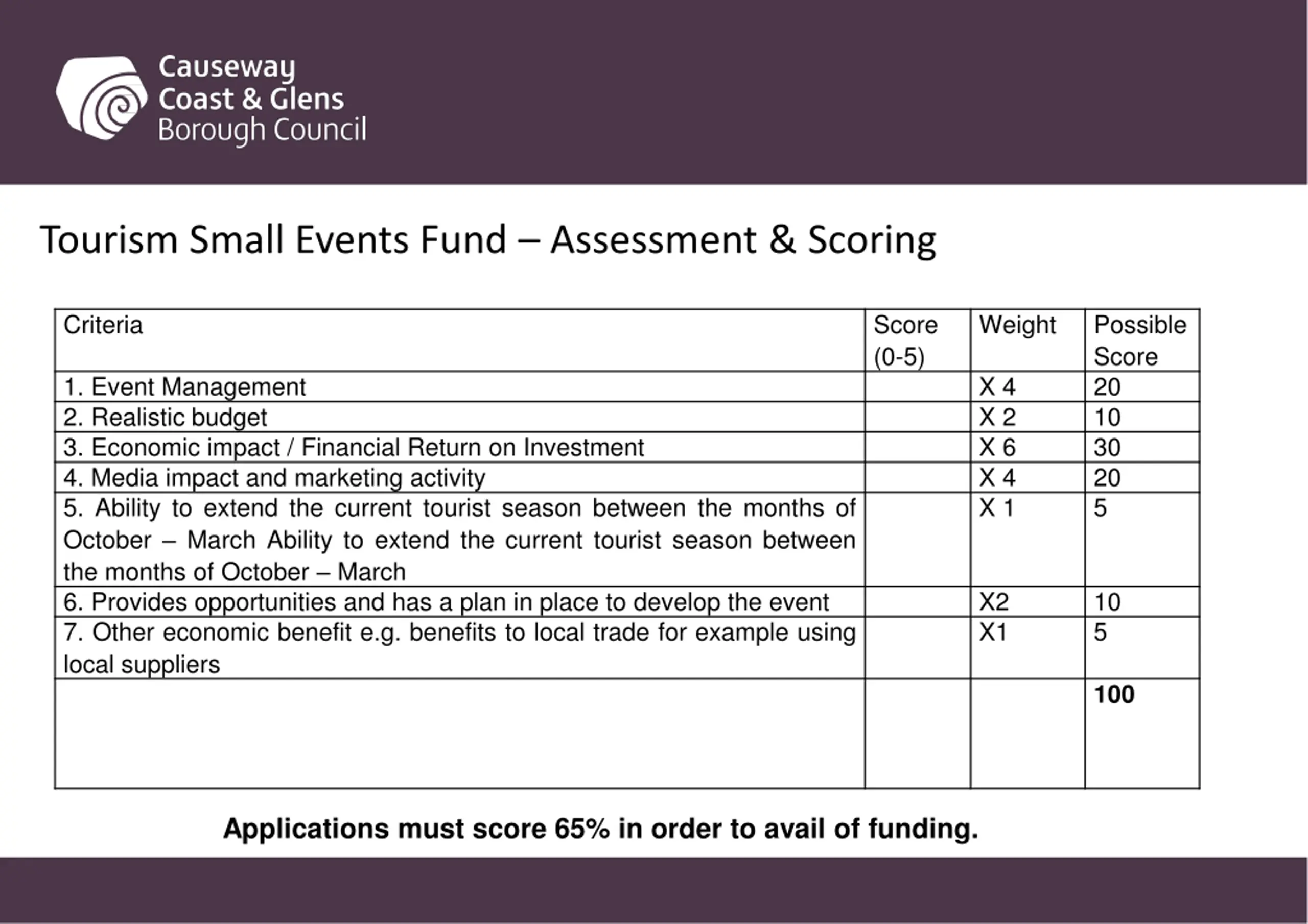 Tourism Small Events Fund Assessment & Scoring Criteria Score (0-5) Weight Possible Score 20 10 30 20 5 1. Event Management 2. Realistic budget 3. Economic impact / Financial Return on Investment 4. Media impact and marketing activity 5. Ability to extend the current tourist season between the months of October March Ability to extend the current tourist season between the months of October March 6. Provides opportunities and has a plan in place to develop the event 7. Other economic benefit e.g. benefits to local trade for example using local suppliers X 4 X 2 X 6 X 4 X 1 X2 X1 10 5 100 Applications must score 65% in order to avail of funding.