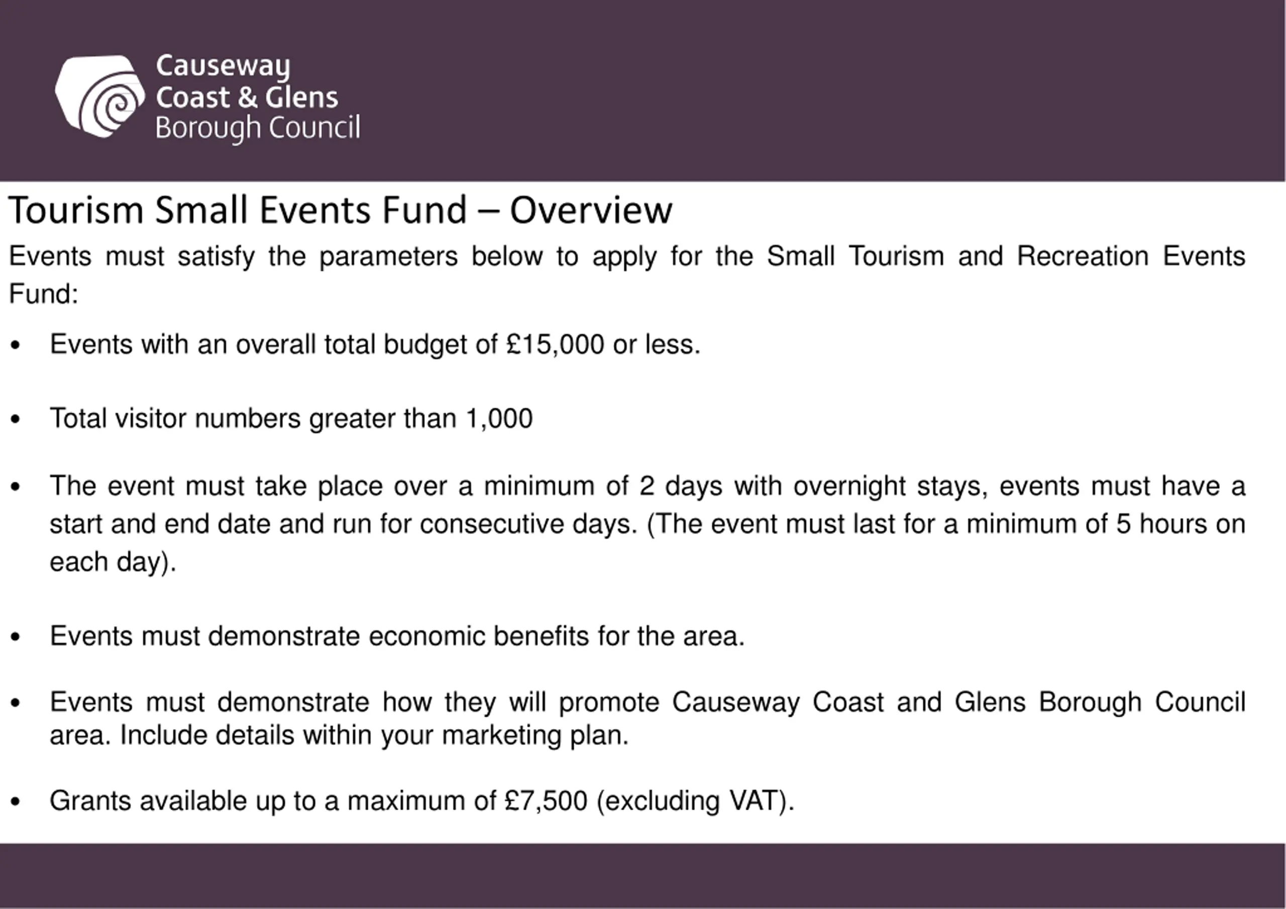 Tourism Small Events Fund Overview Events must satisfy the parameters below to apply for theSmall Tourism and Recreation Events Fund: Events with an overall total budget of 15,000 or less. Total visitor numbers greater than 1,000 The event must take place over a minimum of 2 days with overnight stays, events must have a start and end date and run for consecutive days. (The event must last for a minimum of 5 hours on each day). Events must demonstrate economic benefits for the area. Events must demonstrate how they will promote Causeway Coast and Glens Borough Council area. Include details within your marketing plan. Grants available up to a maximum of 7,500 (excluding VAT).