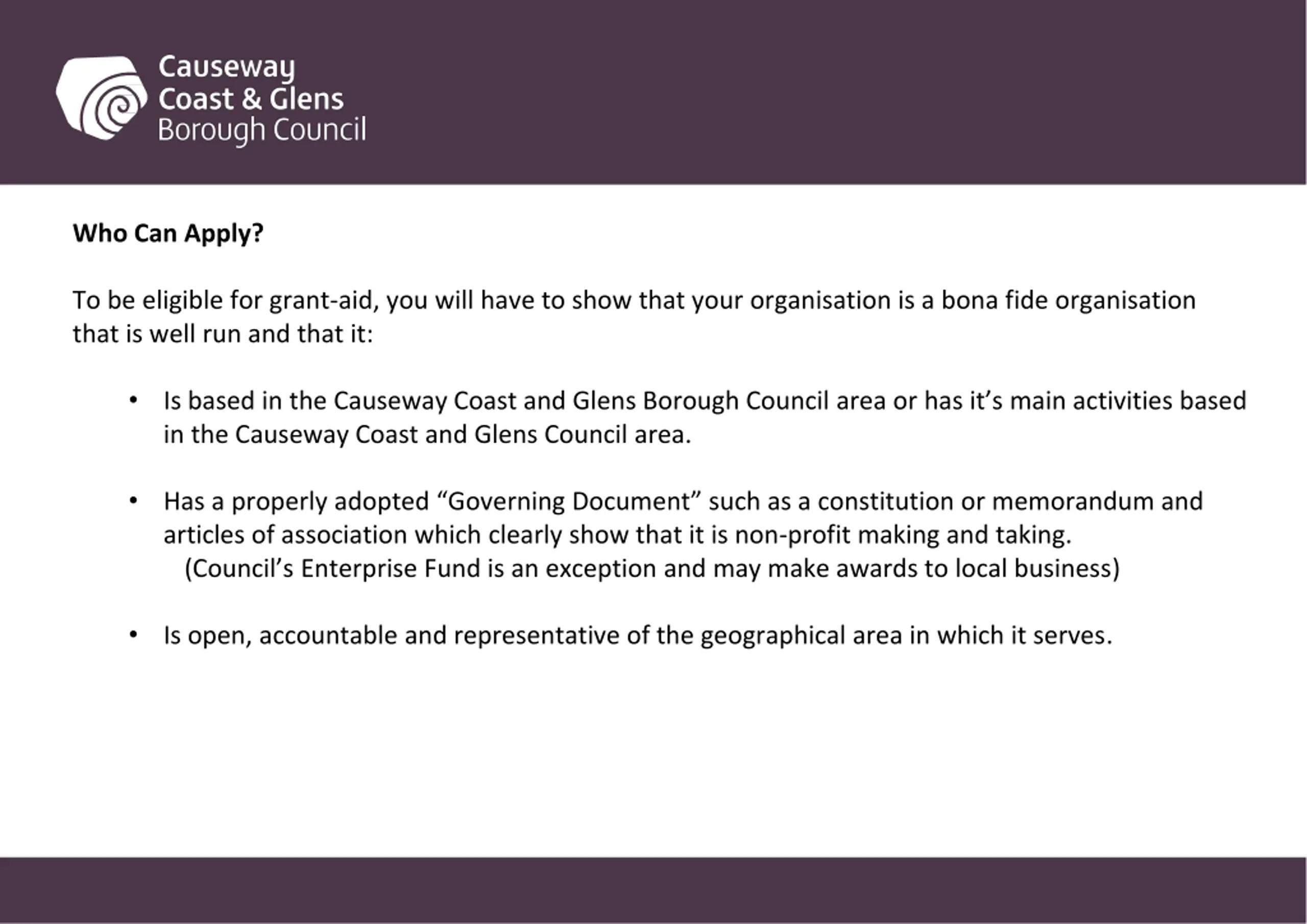 Who Can Apply? To be eligible for grant-aid, you will have to show that your organisation is a bona fide organisation that is well run and that it: Is based in the Causeway Coast and Glens Borough Council area or has it s main activities based in the Causeway Coast and Glens Council area. Has a properly adopted Governing Document such as a constitution or memorandum and articles of association which clearly show that it is non-profit making and taking. (Council s Enterprise Fund is an exception and may make awards to local business) Is open, accountable and representative of the geographical area in which it serves.