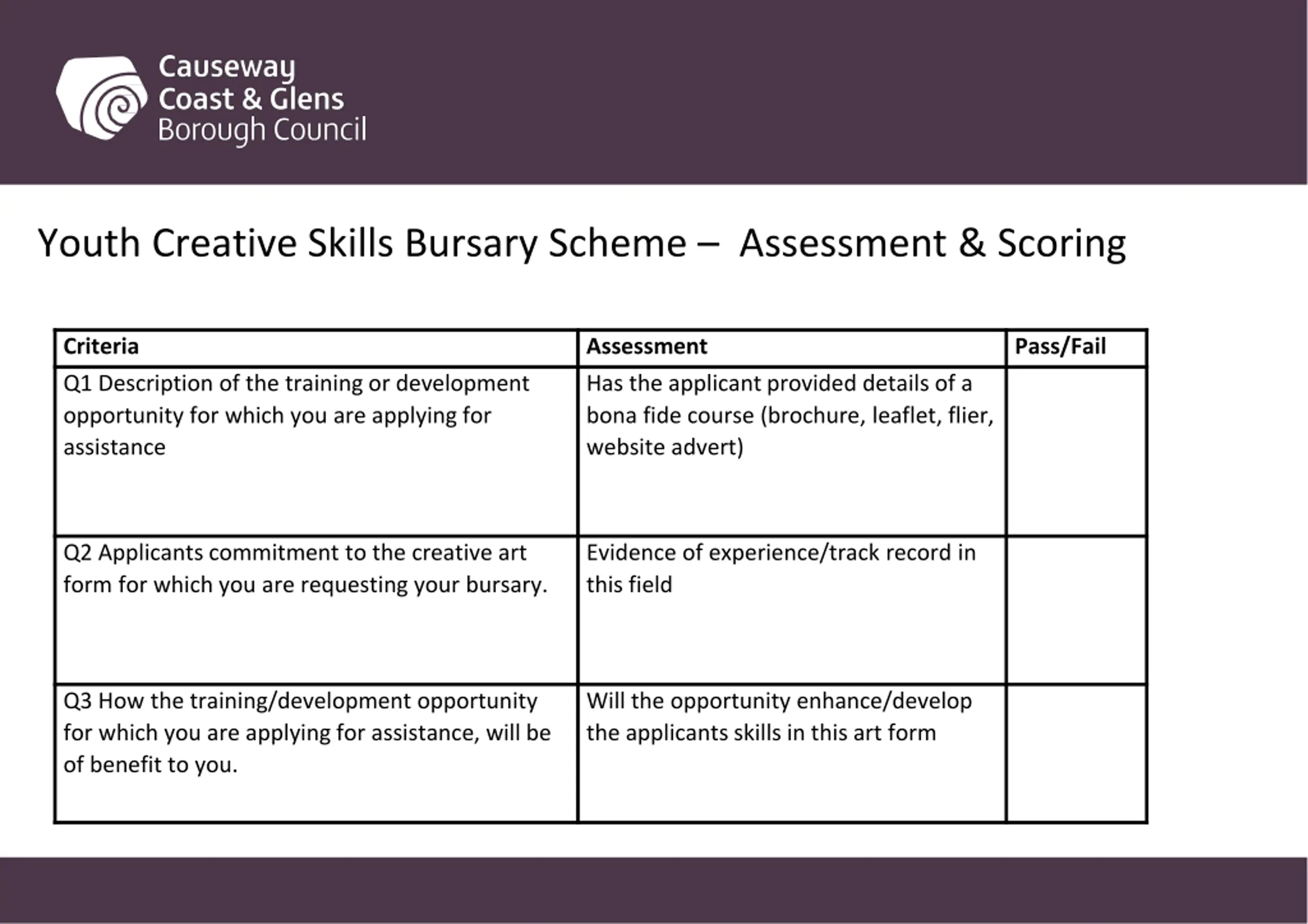 Youth Creative Skills Bursary Scheme Assessment & Scoring Criteria Q1 Description of the training or development opportunity for which you are applying for assistance Assessment Has the applicant provided details of a bona fide course (brochure, leaflet, flier, website advert) Pass/Fail Q2 Applicants commitment to the creative art form for which you are requesting your bursary. Evidence of experience/track record in this field Q3 How the training/development opportunity for which you are applying for assistance, will be of benefit to you. Will the opportunity enhance/develop the applicants skills in this art form