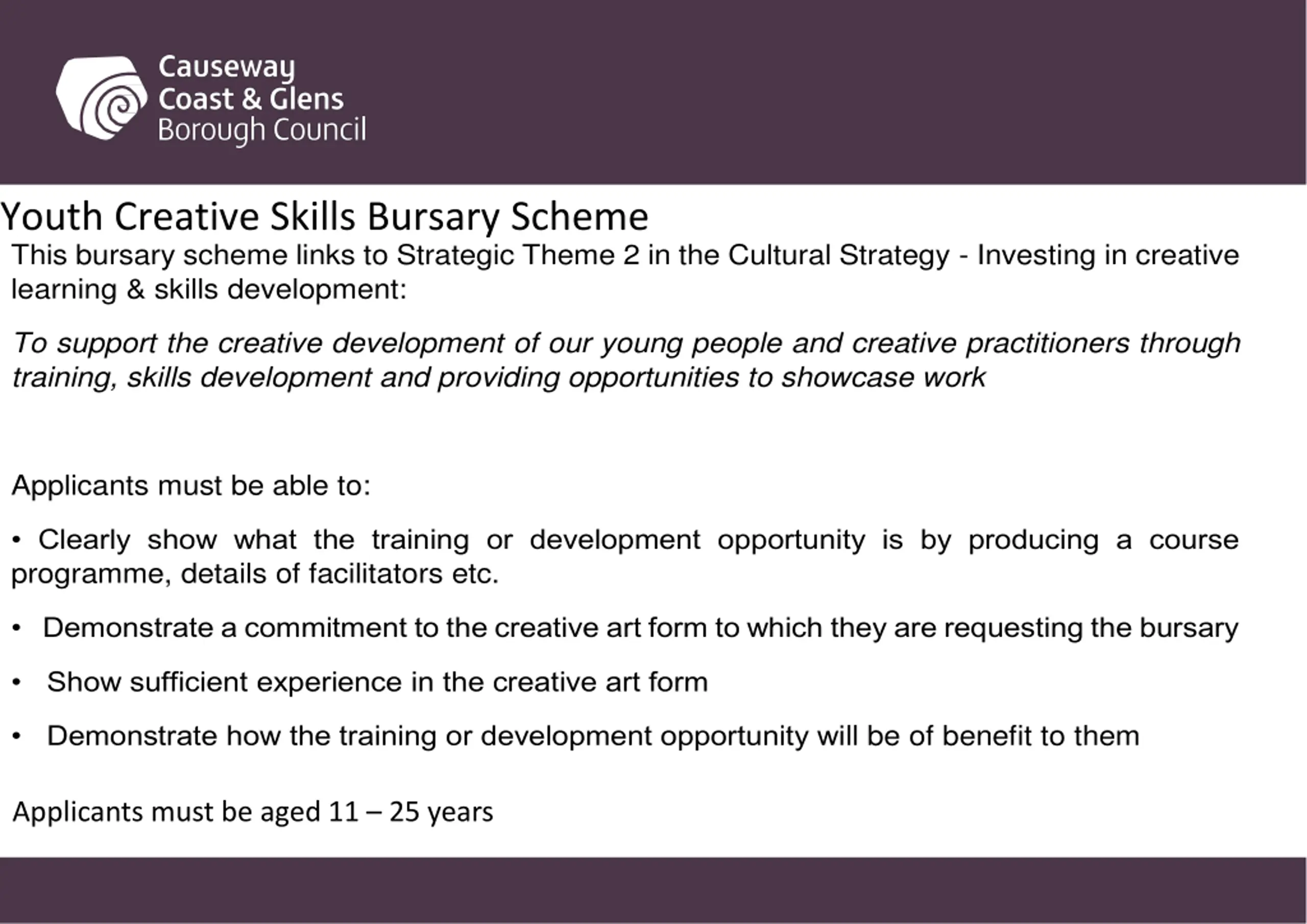 Youth Creative Skills Bursary Scheme This bursary scheme links to Strategic Theme 2 in the Cultural Strategy - Investing in creative learning & skills development: To support the creative development of our young people and creative practitioners through training, skills development and providing opportunities to showcase work Applicants must be able to: Clearly show what the training or development opportunity is by producing a course programme, details of facilitators etc. Demonstrate a commitment to the creative art form to which they are requesting the bursary Show sufficient experience in the creative art form Demonstrate how the training or development opportunity will be of benefit to them Applicants must be aged 11 25 years