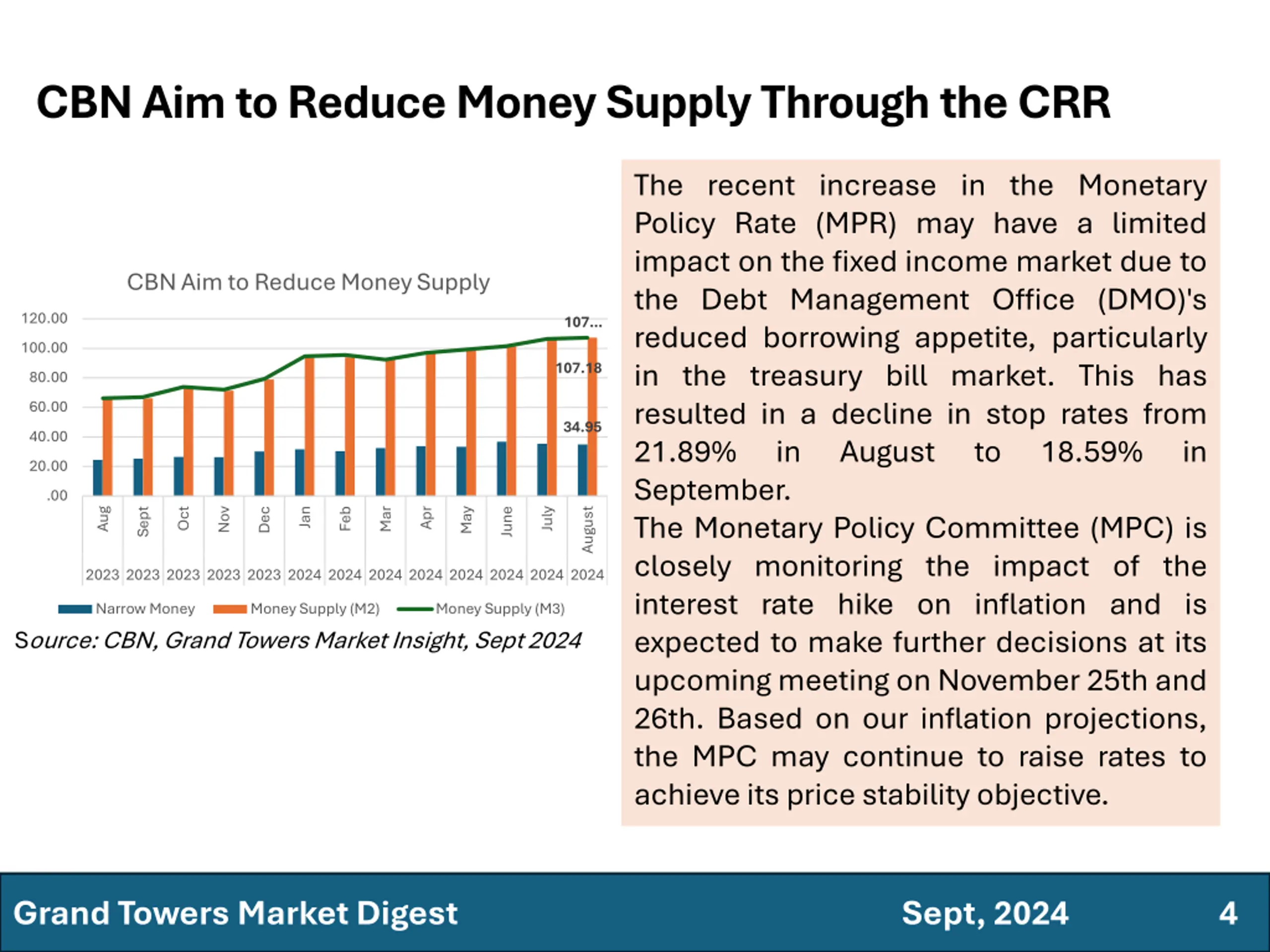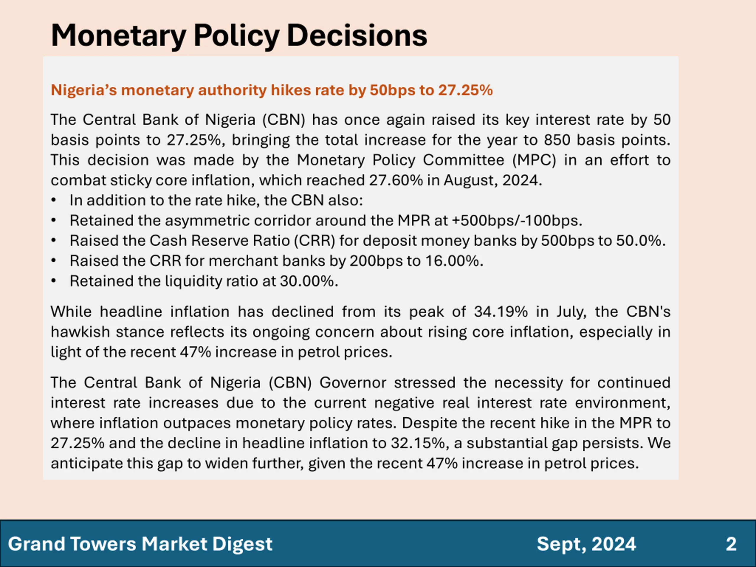 Monetary Policy Decisions Nigeria s monetary authority hikes rate by 50bps to 27.25% The Central Bank of Nigeria (CBN) has once again raised its key interest rate by 50 basis points to 27.25%, bringing the total increase for the year to 850 basis points. This decision was made by the Monetary Policy Committee (MPC) in an effort to combat stickycore inflation, which reached 27.60% in August, 2024. In addition to the rate hike, the CBN also: Retained the asymmetric corridor around the MPR at+500bps/-100bps. Raised the Cash Reserve Ratio (CRR) for deposit money banks by 500bpsto 50.0%. Raised the CRR for merchant banks by 200bpsto 16.00%. Retained the liquidity ratio at30.00%. While headline inflation has declined from its peak of 34.19% in July, the CBN's hawkish stance reflects its ongoing concern about rising core inflation, especially in light of the recent 47% increase in petrol prices. The Central Bank of Nigeria (CBN) Governor stressed the necessity for continued interest rate increases due to the current negative real interest rate environment, where inflation outpaces monetary policy rates. Despite the recent hike in the MPR to 27.25% and the decline in headline inflation to 32.15%, a substantial gap persists. We anticipate this gap to widen further, given the recent 47% increase in petrol prices. Grand Towers Market Digest Sept, 2024 2