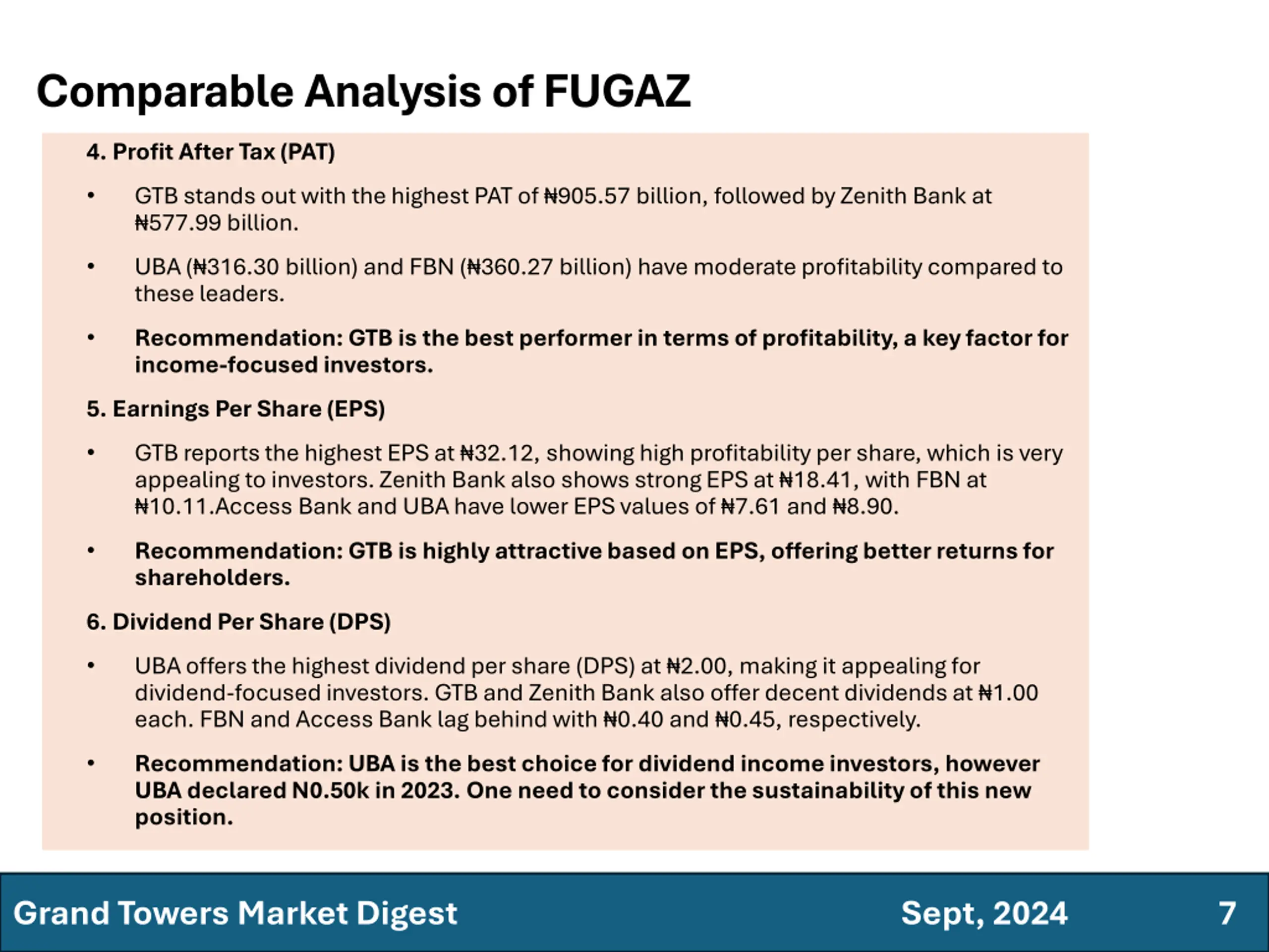 Comparable Analysis of FUGAZ 4. Profit After Tax (PAT) GTB stands out with the highest PAT of 905.57 billion, followed by Zenith Bank at 577.99 billion. UBA ( 316.30 billion) and FBN ( 360.27 billion) have moderate profitability compared to these leaders. Recommendation: GTB is the best performer in terms of profitability, a key factor for income-focused investors. 5. Earnings Per Share (EPS) GTB reports the highest EPS at 32.12, showing high profitability per share, which is very appealing to investors. Zenith Bank also shows strong EPS at 18.41, with FBN at 10.11.Access Bank and UBA have lower EPS values of 7.61 and 8.90. Recommendation: GTB is highly attractive based on EPS, offering better returns for shareholders. 6. Dividend Per Share (DPS) UBA offers the highest dividend per share (DPS) at 2.00, making it appealing for dividend-focused investors. GTB and Zenith Bank also offer decent dividends at 1.00 each. FBN and Access Bank lag behind with 0.40 and 0.45, respectively. Recommendation: UBA is the best choice for dividend income investors, however UBA declared N0.50k in 2023. One need to consider the sustainability of this new position. Grand Towers Market Digest Sept, 2024 7