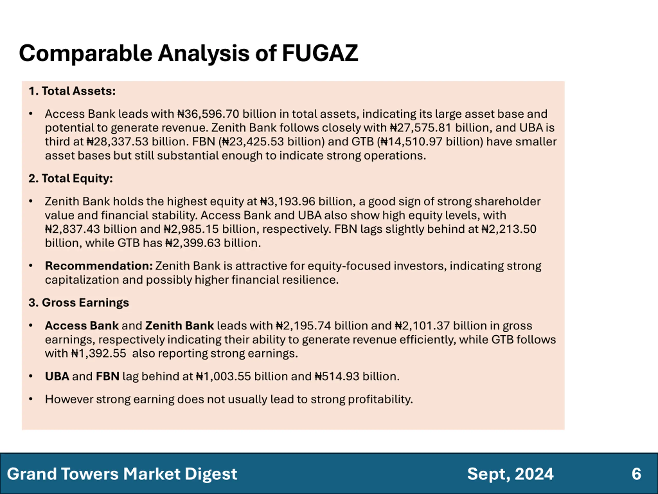 Comparable Analysis of FUGAZ 1. Total Assets: Access Bank leads with 36,596.70 billion in total assets, indicating its large asset base and potential to generate revenue. Zenith Bank follows closely with 27,575.81 billion, and UBA is third at 28,337.53 billion. FBN ( 23,425.53 billion) and GTB ( 14,510.97 billion) have smaller asset bases but still substantial enough to indicate strong operations. 2. Total Equity: Zenith Bank holds the highest equity at 3,193.96 billion, a good sign of strong shareholder value and financial stability. Access Bank and UBA also show high equity levels, with 2,837.43 billion and 2,985.15 billion, respectively. FBN lags slightly behind at 2,213.50 billion, while GTB has 2,399.63 billion. Recommendation: Zenith Bank is attractive for equity-focused investors, indicating strong capitalization and possibly higher financial resilience. 3. Gross Earnings Access Bank and Zenith Bankleads with 2,195.74 billion and 2,101.37 billion in gross earnings, respectively indicating their ability to generate revenue efficiently, while GTB follows with 1,392.55 also reporting strong earnings. UBA and FBNlag behind at 1,003.55 billion and 514.93 billion. However strong earning does not usually lead to strong profitability. Grand Towers Market Digest Sept, 2024 6