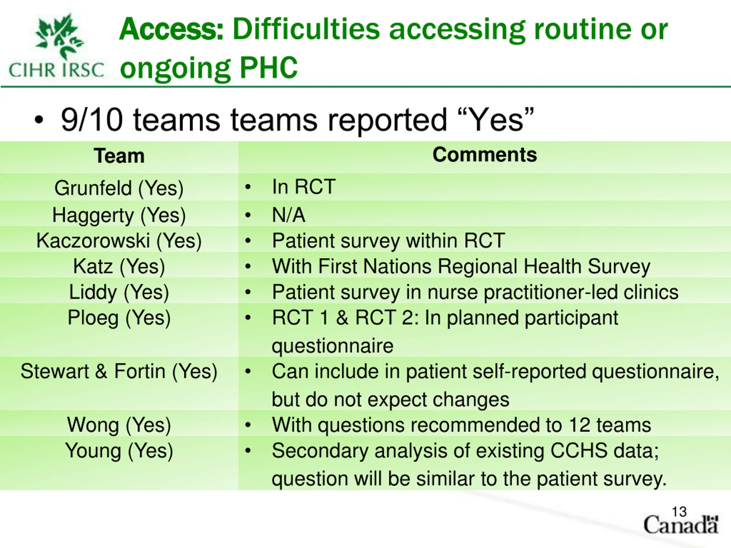 Access: Access: Difficulties accessing routine or ongoing PHC 9/10 teams teams reported Yes Team Grunfeld (Yes) In RCT Haggerty (Yes) N/A Kaczorowski (Yes) Patient survey within RCT Katz (Yes) With First Nations Regional Health Survey Liddy (Yes) Patient survey in nurse practitioner-led clinics Ploeg (Yes) RCT 1 & RCT 2: In planned participant questionnaire Stewart & Fortin (Yes) Can include in patient self-reported questionnaire, but do not expect changes Wong (Yes) With questions recommended to 12 teams Young (Yes) Secondary analysis of existing CCHS data; question will be similar to the patient survey. Comments 13