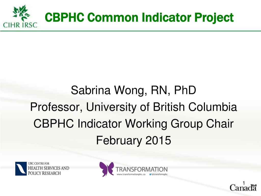 CBPHC Common Indicator Project CBPHC Common Indicator Project Sabrina Wong, RN, PhD Professor, University of British Columbia CBPHC Indicator Working Group Chair February 2015 1
