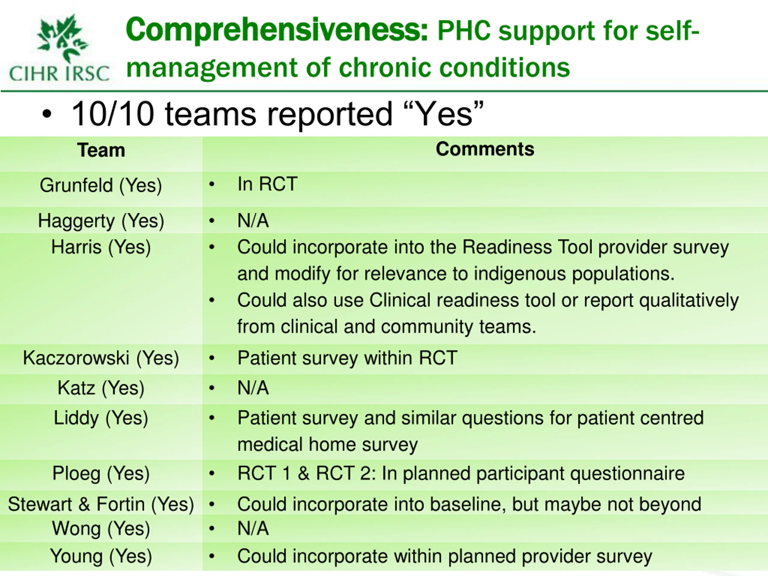 Comprehensiveness: Comprehensiveness: PHC support for self- management of chronic conditions 10/10 teams reported Yes Team Comments In RCT Grunfeld (Yes) Haggerty (Yes) Harris (Yes) N/A Could incorporate into the Readiness Tool provider survey and modify for relevance to indigenous populations. Could also use Clinical readiness tool or report qualitatively from clinical and community teams. Patient survey within RCT N/A Patient survey and similar questions for patient centred medical home survey RCT 1 & RCT 2: In planned participant questionnaire Could incorporate into baseline, but maybe not beyond N/A Could incorporate within planned provider survey Kaczorowski (Yes) Katz (Yes) Liddy (Yes) Ploeg (Yes) Stewart & Fortin (Yes) Wong (Yes) Young (Yes) 14
