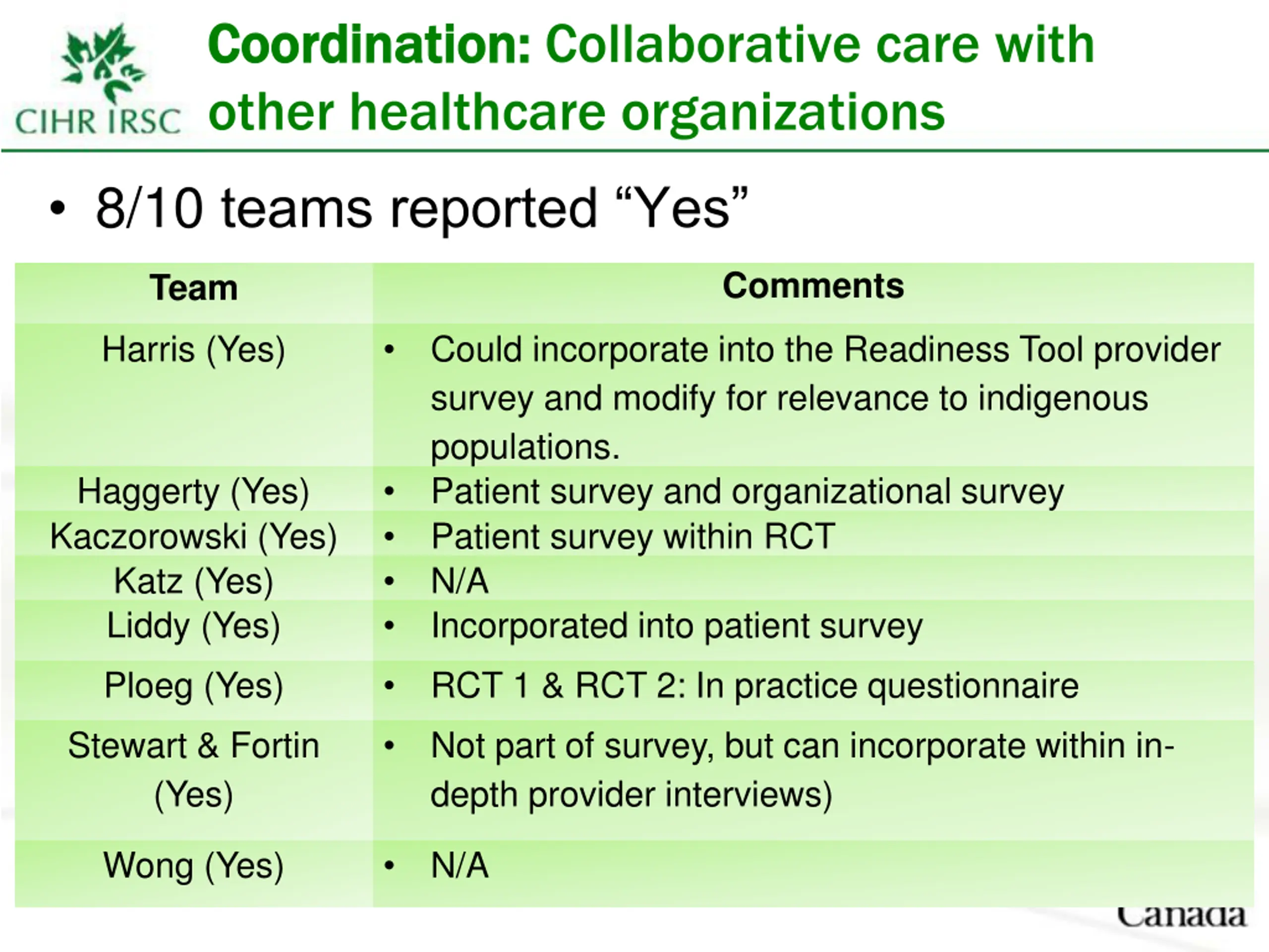 Coordination: Coordination: Collaborative care with other healthcare organizations 8/10 teams reported Yes Comments Team Harris (Yes) Could incorporate into the Readiness Tool provider survey and modify for relevance to indigenous populations. Patient survey and organizational survey Patient survey within RCT N/A Incorporated into patient survey Haggerty (Yes) Kaczorowski (Yes) Katz (Yes) Liddy (Yes) Ploeg (Yes) RCT 1 & RCT 2: In practice questionnaire Stewart & Fortin (Yes) Not part of survey, but can incorporate within in- depth provider interviews) Wong (Yes) N/A 17