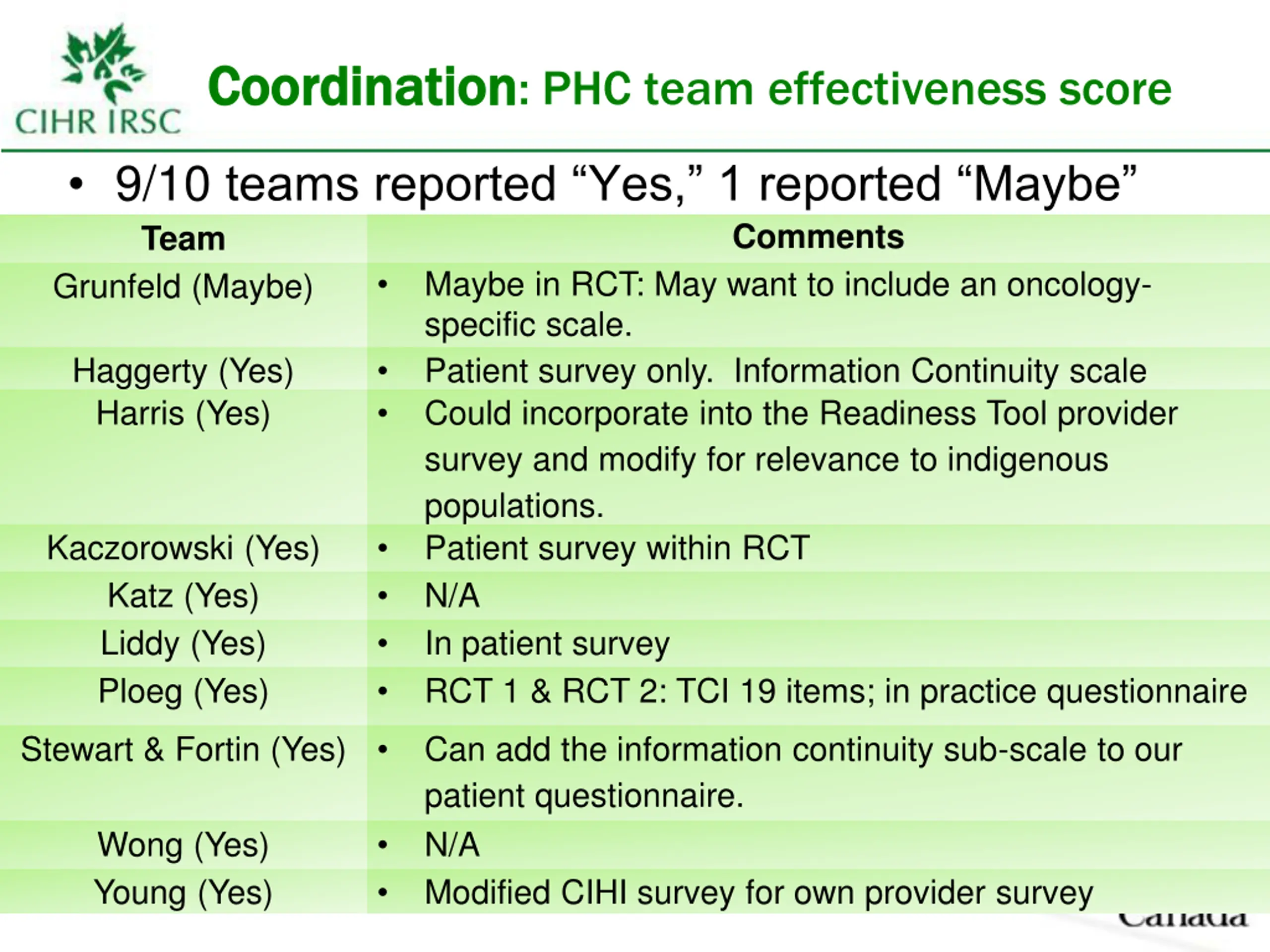 Coordination Coordination: PHC team effectiveness score 9/10 teams reported Yes, 1 reported Maybe Team Grunfeld (Maybe) Maybe in RCT: May want to include an oncology- specific scale. Haggerty (Yes) Patient survey only. Information Continuity scale Harris (Yes) Could incorporate into the Readiness Tool provider survey and modify for relevance to indigenous populations. Kaczorowski (Yes) Patient survey within RCT Katz (Yes) N/A Liddy (Yes) In patient survey Ploeg (Yes) RCT 1 & RCT 2: TCI 19 items; in practice questionnaire Comments Stewart & Fortin (Yes) Can add the information continuity sub-scale to our patient questionnaire. N/A Modified CIHI survey for own provider survey Wong (Yes) Young (Yes) 16