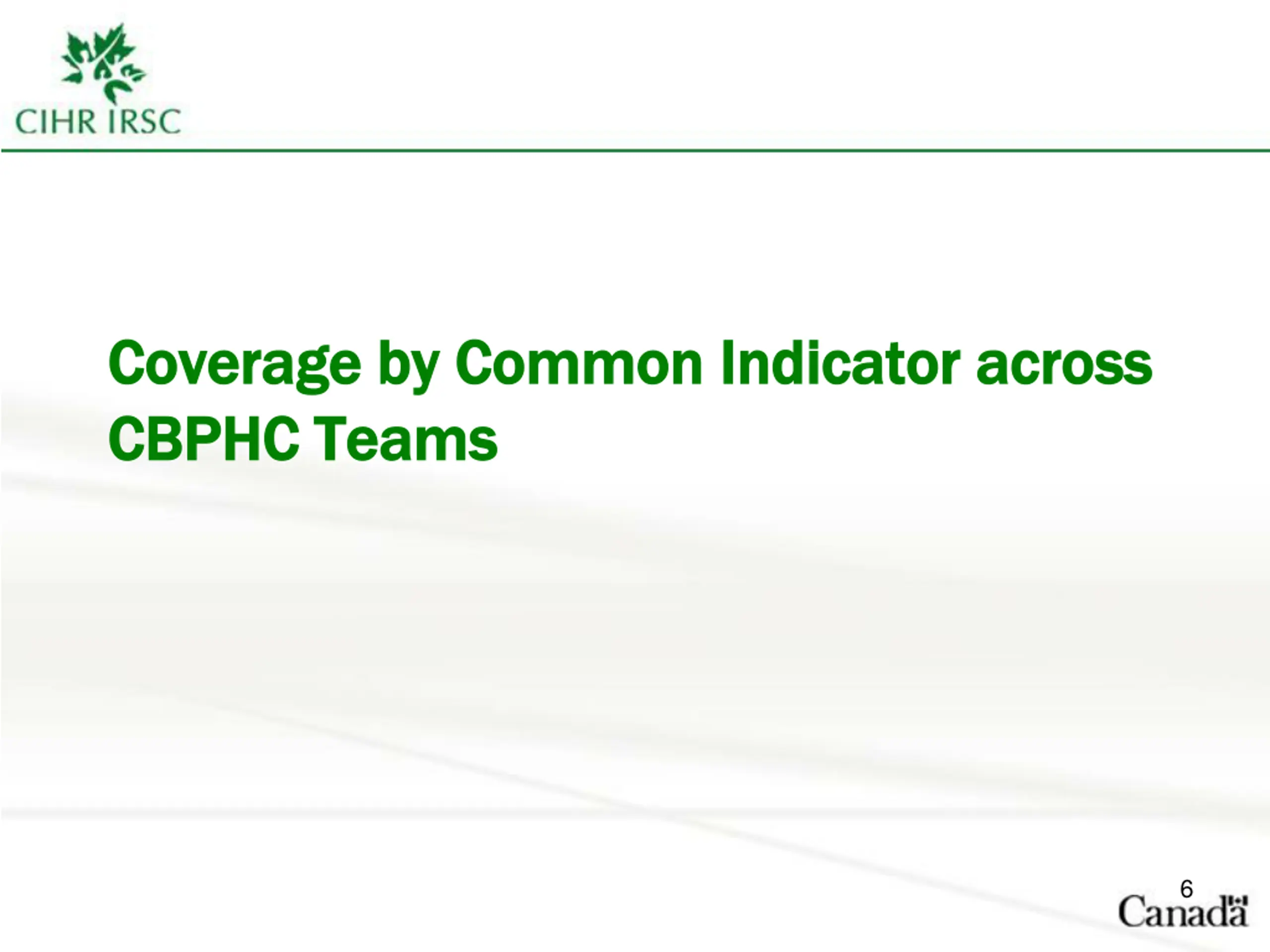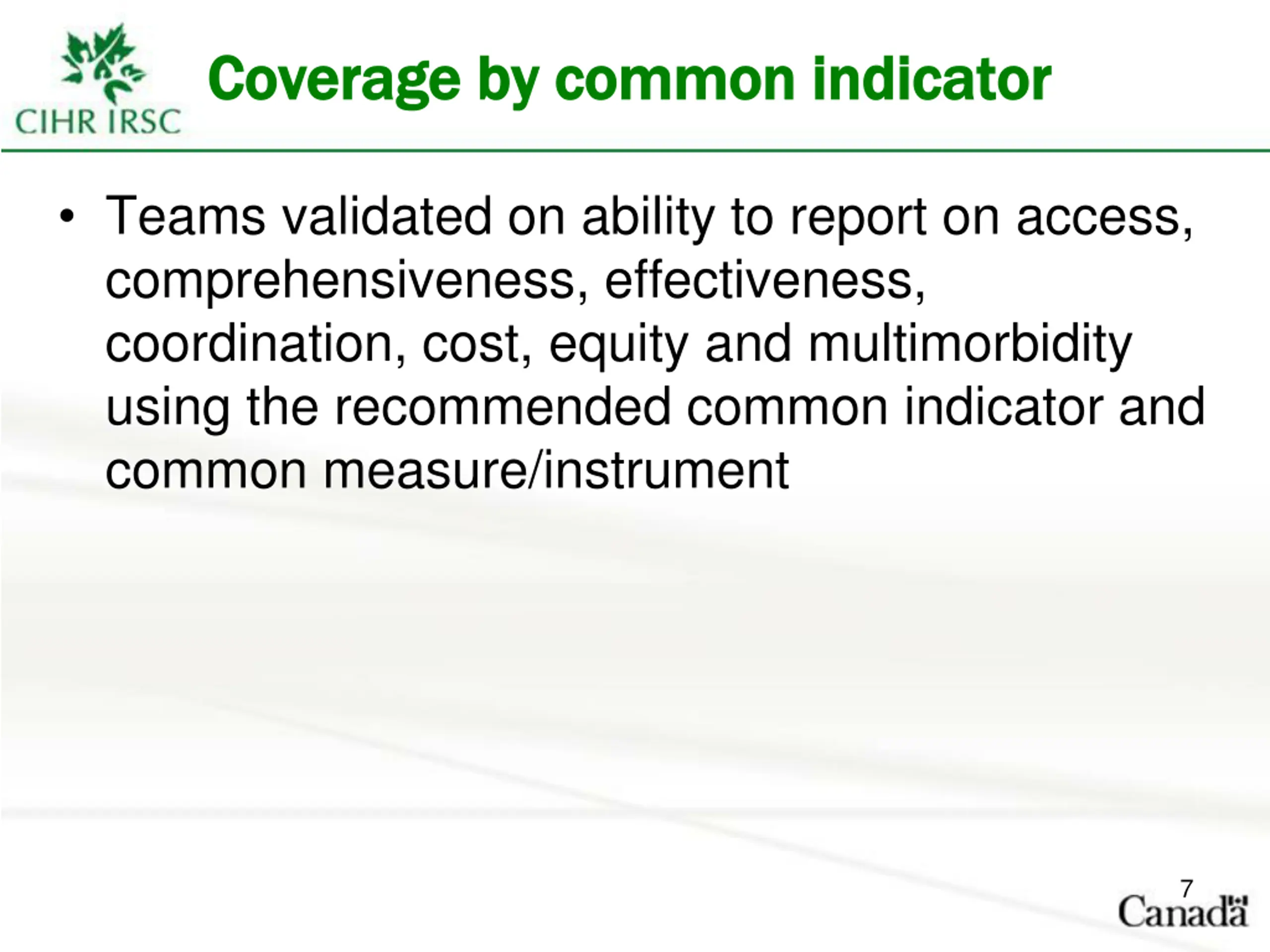 Coverage by common indicator Coverage by common indicator Teams validated on ability to report on access, comprehensiveness, effectiveness, coordination, cost, equity and multimorbidity using the recommended common indicator and common measure/instrument 7