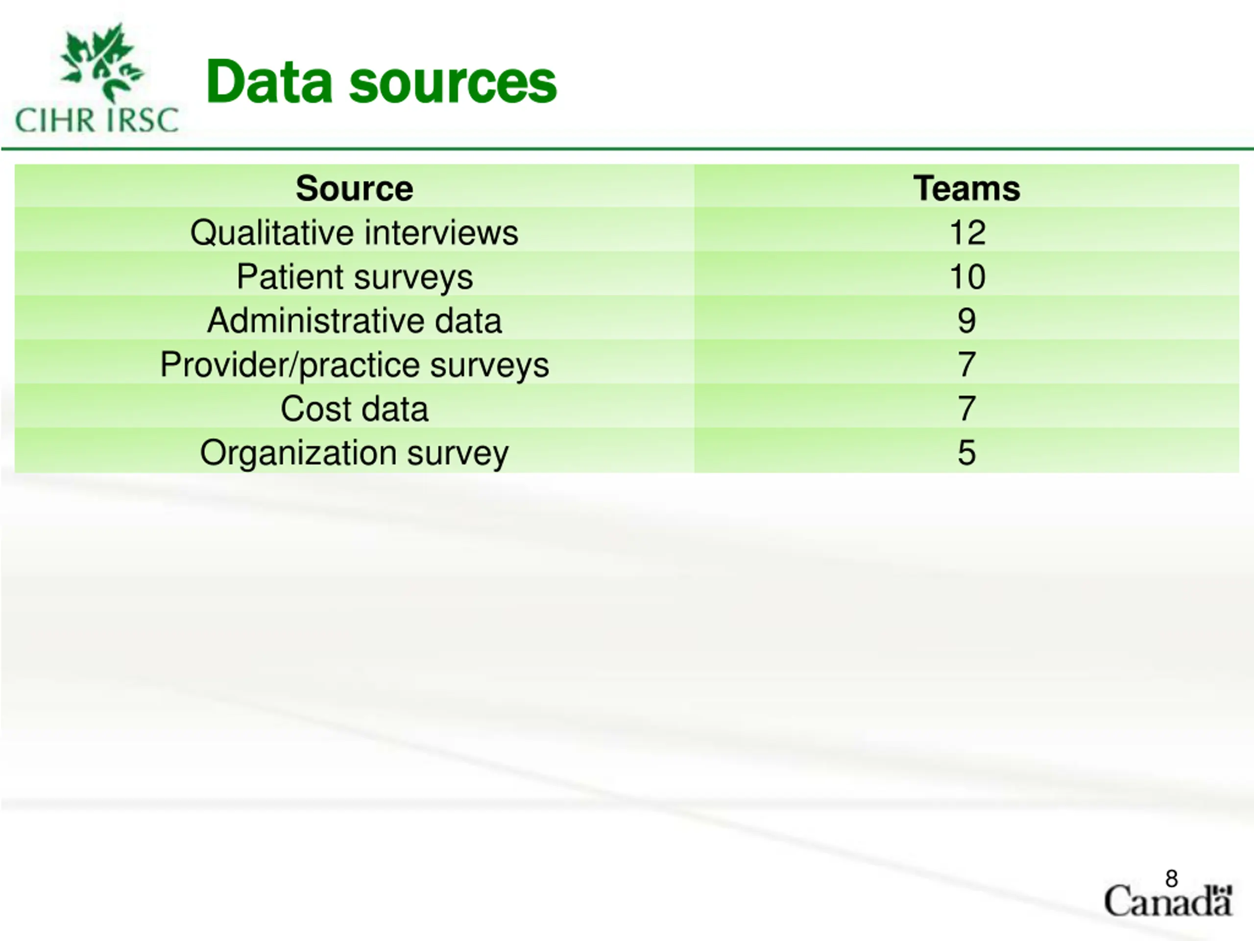 Data Data s sources ources Source Teams 12 10 9 7 7 5 Qualitative interviews Patient surveys Administrative data Provider/practice surveys Cost data Organization survey 8