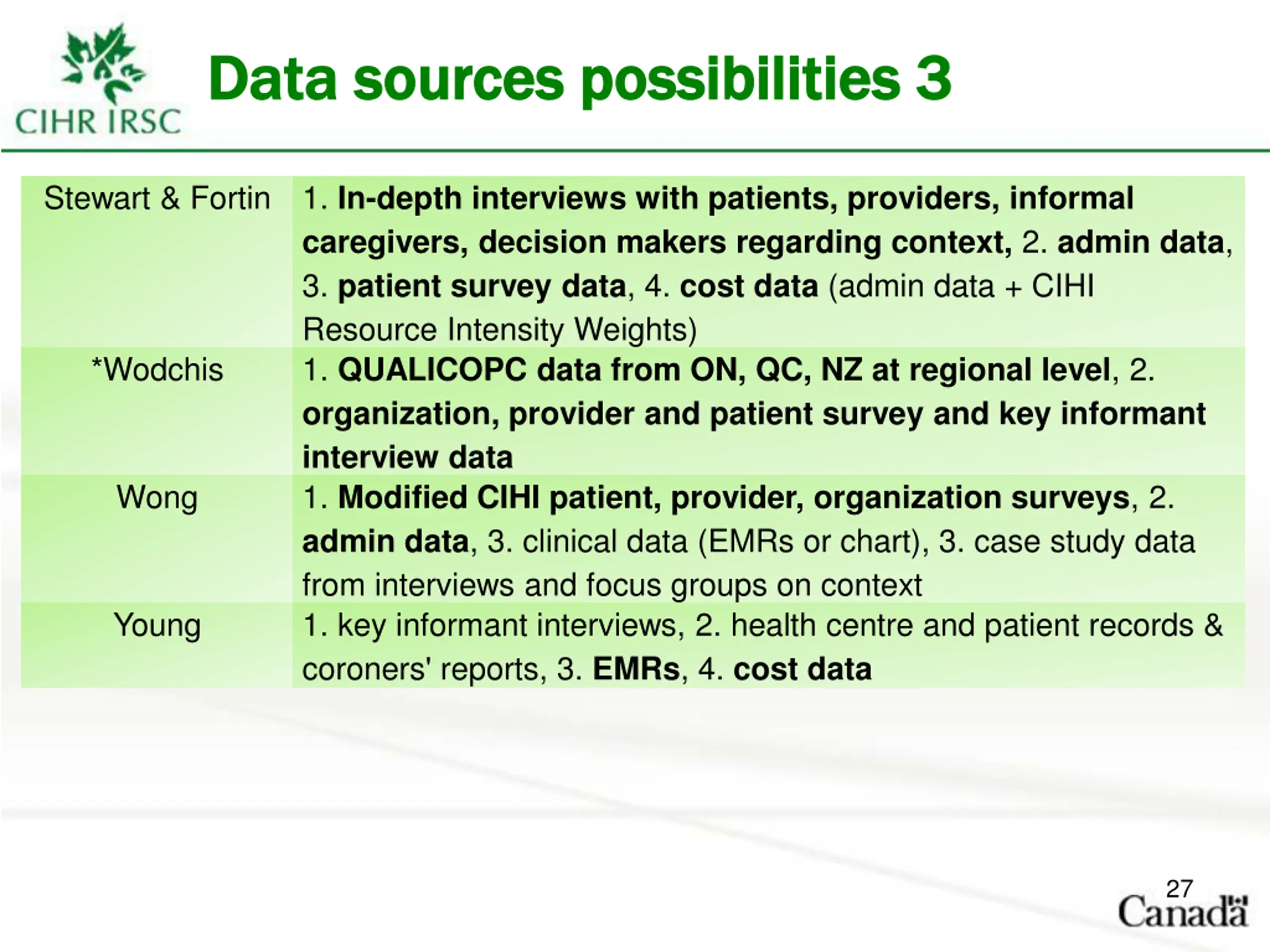 Data sources possibilities 3 Data sources possibilities 3 Stewart & Fortin 1. In-depth interviews with patients, providers, informal caregivers, decision makers regarding context, 2. admin data, 3. patient survey data, 4. cost data (admin data + CIHI Resource Intensity Weights) 1. QUALICOPC data from ON, QC, NZ at regional level, 2. organization, provider and patient survey and key informant interview data 1. Modified CIHI patient, provider, organization surveys, 2. admin data, 3. clinical data (EMRs or chart), 3. case study data from interviews and focus groups on context 1. key informant interviews, 2. health centre and patient records & coroners' reports, 3. EMRs, 4. cost data *Wodchis Wong Young 27