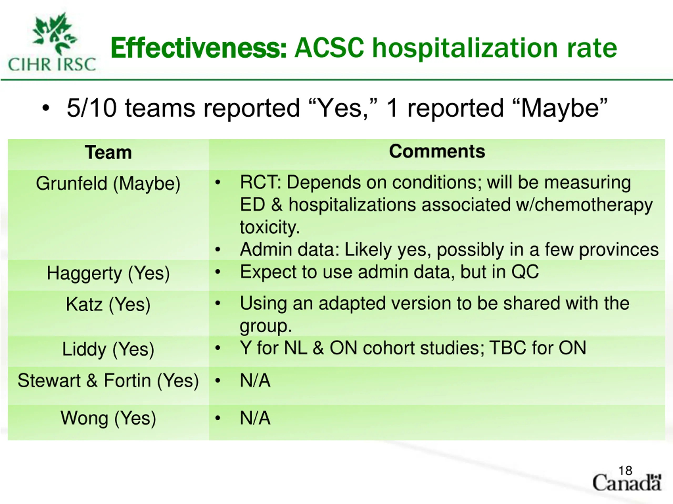 Effectiveness: Effectiveness: ACSC hospitalization rate 5/10 teams reported Yes, 1 reported Maybe Comments Team RCT: Depends on conditions; will be measuring ED & hospitalizations associated w/chemotherapy toxicity. Admin data: Likely yes, possibly in a few provinces Expect to use admin data, but in QC Grunfeld (Maybe) Haggerty (Yes) Using an adapted version to be shared with the group. Y for NL & ON cohort studies; TBC for ON Katz (Yes) Liddy (Yes) Stewart & Fortin (Yes) N/A Wong (Yes) N/A 18
