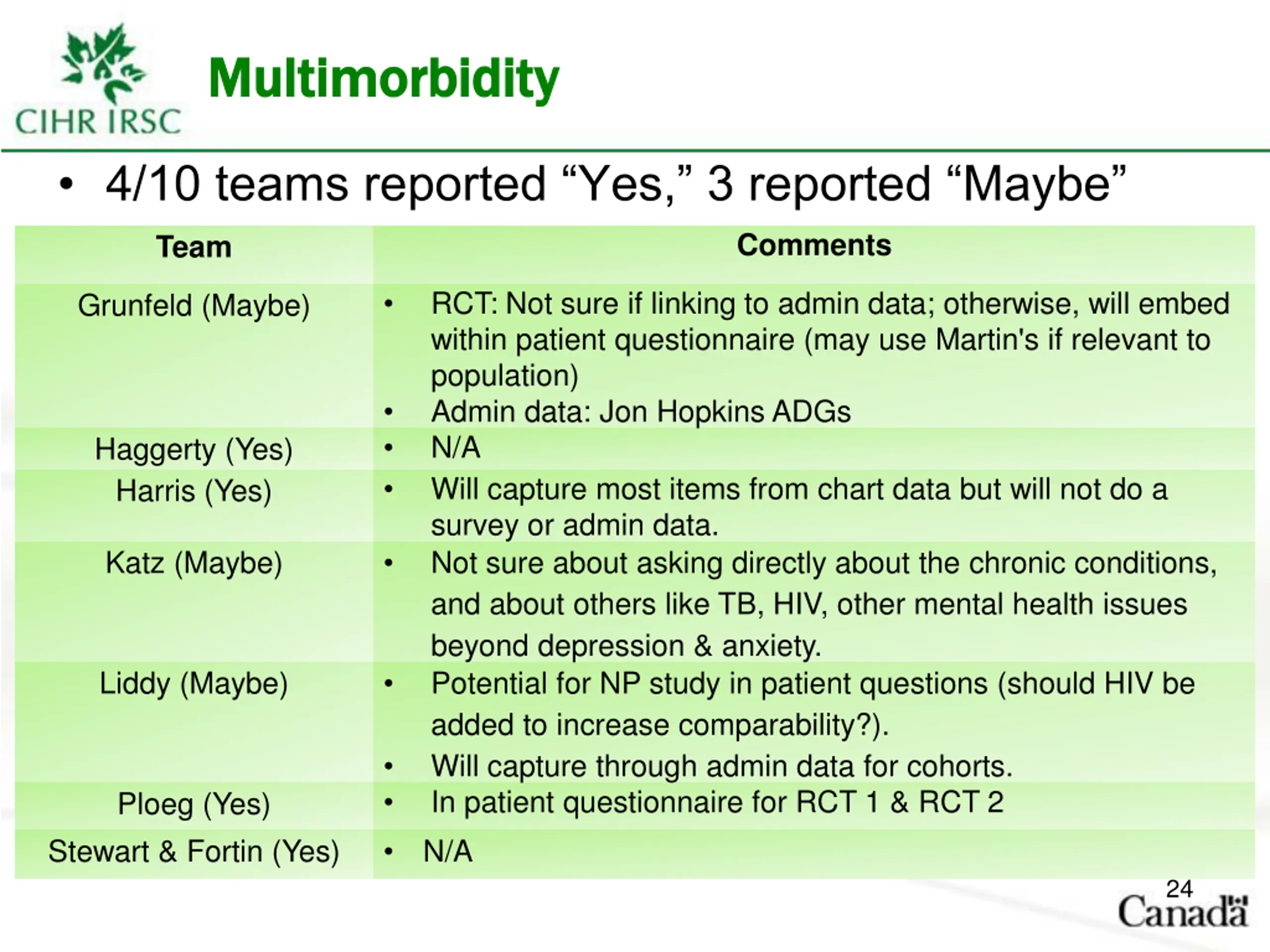 Multimorbidity Multimorbidity 4/10 teams reported Yes, 3 reported Maybe Comments Team RCT: Not sure if linking to admin data; otherwise, will embed within patient questionnaire (may use Martin's if relevant to population) Admin data: Jon Hopkins ADGs N/A Will capture most items from chart data but will not do a survey or admin data. Not sure about asking directly about the chronic conditions, and about others like TB, HIV, other mental health issues beyond depression & anxiety. Potential for NP study in patient questions (should HIV be added to increase comparability?). Will capture through admin data for cohorts. In patient questionnaire for RCT 1 & RCT 2 N/A Grunfeld (Maybe) Haggerty (Yes) Harris (Yes) Katz (Maybe) Liddy (Maybe) Ploeg (Yes) Stewart & Fortin (Yes) 24