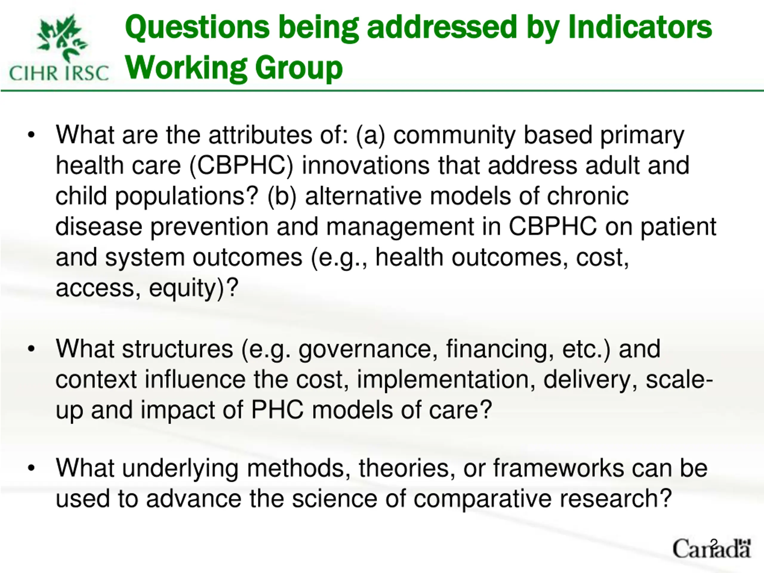 Questions being addressed by Indicators Questions being addressed by Indicators Working Group Working Group What are the attributes of: (a) community based primary health care (CBPHC) innovations that address adult and child populations? (b) alternative models of chronic disease prevention and management in CBPHC on patient and system outcomes (e.g., health outcomes, cost, access, equity)? What structures (e.g. governance, financing, etc.) and context influence the cost, implementation, delivery, scale- up and impact of PHC models of care? What underlying methods, theories, or frameworks can be used to advance the science of comparative research? 2