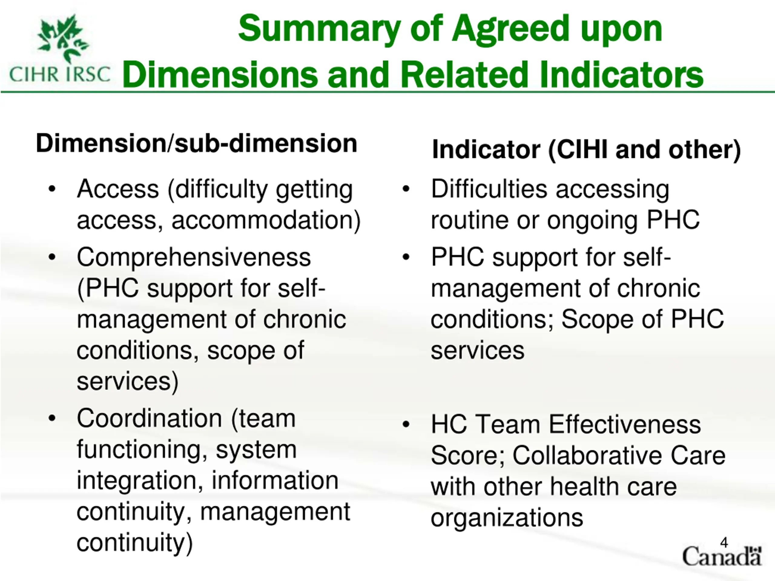 Summary of Agreed upon Summary of Agreed upon Dimensions and Related Dimensions and Related I Indicators ndicators Dimension/sub-dimension Indicator (CIHI and other) Difficulties accessing routine or ongoing PHC PHC support for self- management of chronic conditions; Scope of PHC services Access (difficulty getting access, accommodation) Comprehensiveness (PHC support for self- management of chronic conditions, scope of services) Coordination (team functioning, system integration, information continuity, management continuity) HC Team Effectiveness Score; Collaborative Care with other health care organizations 4