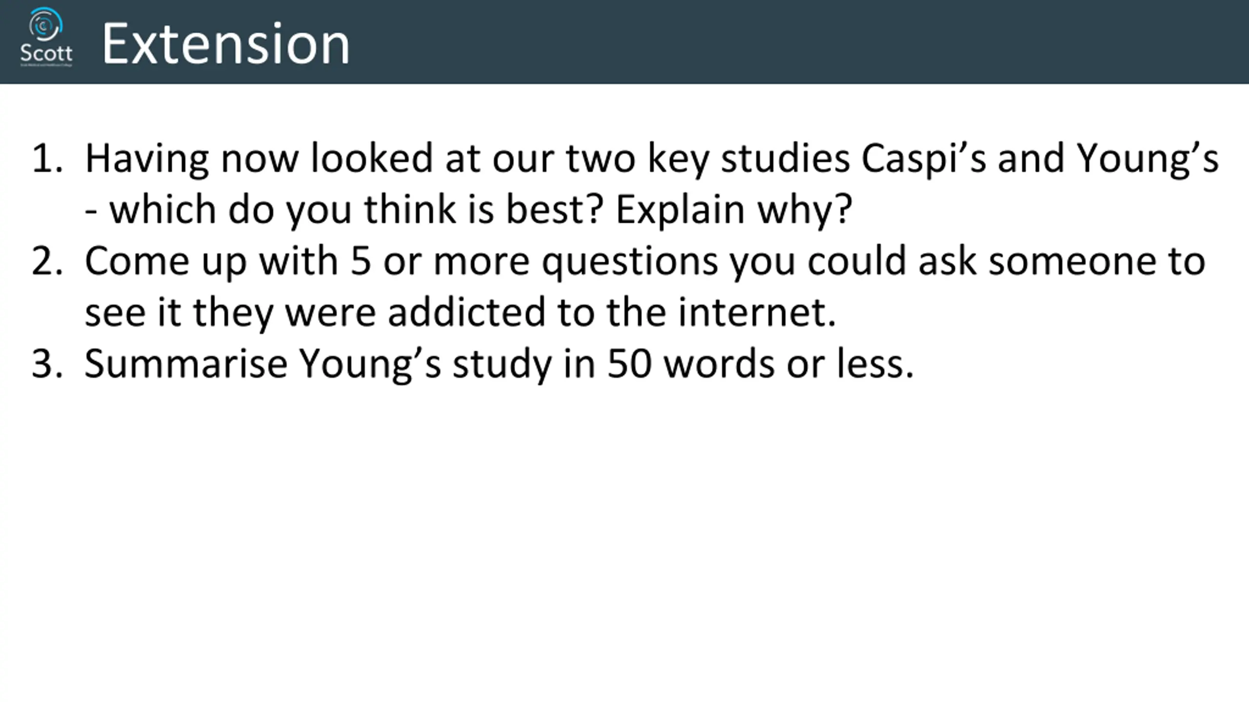 Extension 1. Having now looked at our two key studies Caspi s and Young s - which do you think is best? Explain why? 2. Come up with 5 or more questions you could ask someone to see it they were addicted to the internet. 3. Summarise Young s study in 50 words or less.