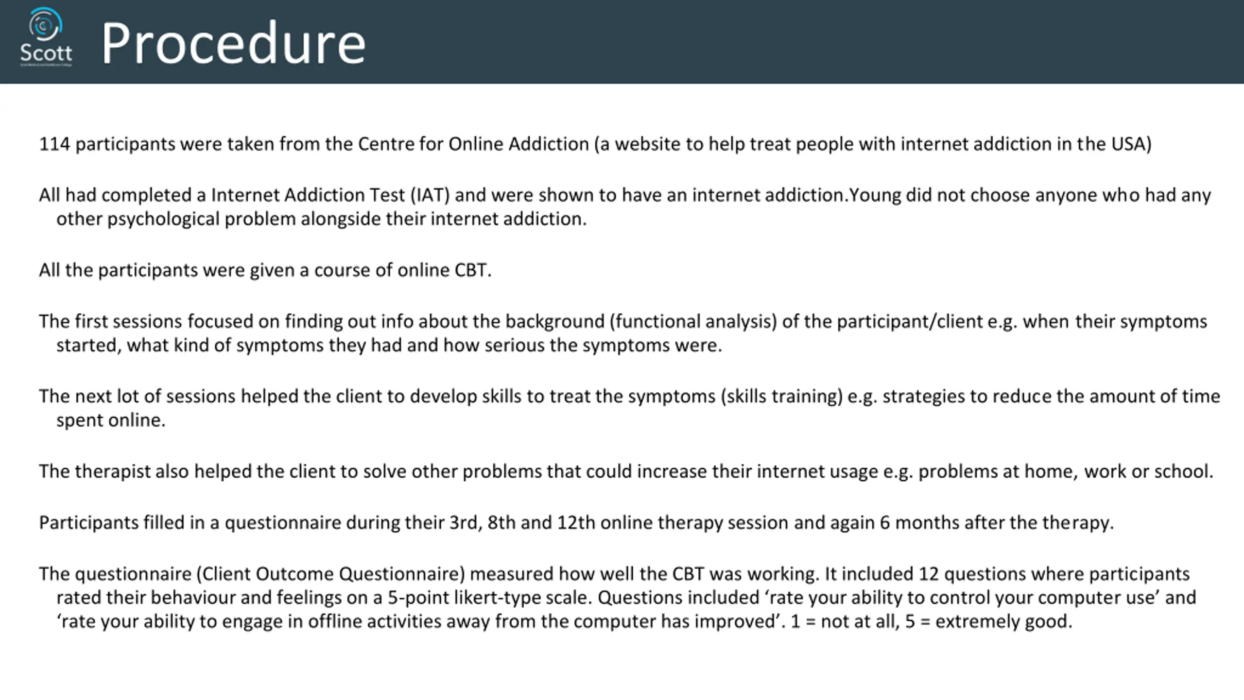 Procedure 114 participants were taken from the Centre for Online Addiction (a website to help treat people with internet addiction in the USA) All had completed a Internet Addiction Test (IAT) and were shown to have an internet addiction.Young did not choose anyone who had any other psychological problem alongside their internet addiction. All the participants were given a course of online CBT. The first sessions focused on finding out info about the background (functional analysis) of the participant/client e.g. when their symptoms started, what kind of symptoms they had and how serious the symptoms were. The next lot of sessions helped the client to develop skills to treat the symptoms (skills training) e.g. strategies to reduce the amount of time spent online. The therapist also helped the client to solve other problems that could increase their internet usage e.g. problems at home, work or school. Participants filled in a questionnaire during their 3rd, 8th and 12th online therapy session and again 6 months after the therapy. The questionnaire (Client Outcome Questionnaire) measured how well the CBT was working. It included 12 questions where participants rated their behaviour and feelings on a 5-point likert-type scale. Questions included rate your ability to control your computer use and rate your ability to engage in offline activities away from the computer has improved . 1 = not at all, 5 = extremely good.