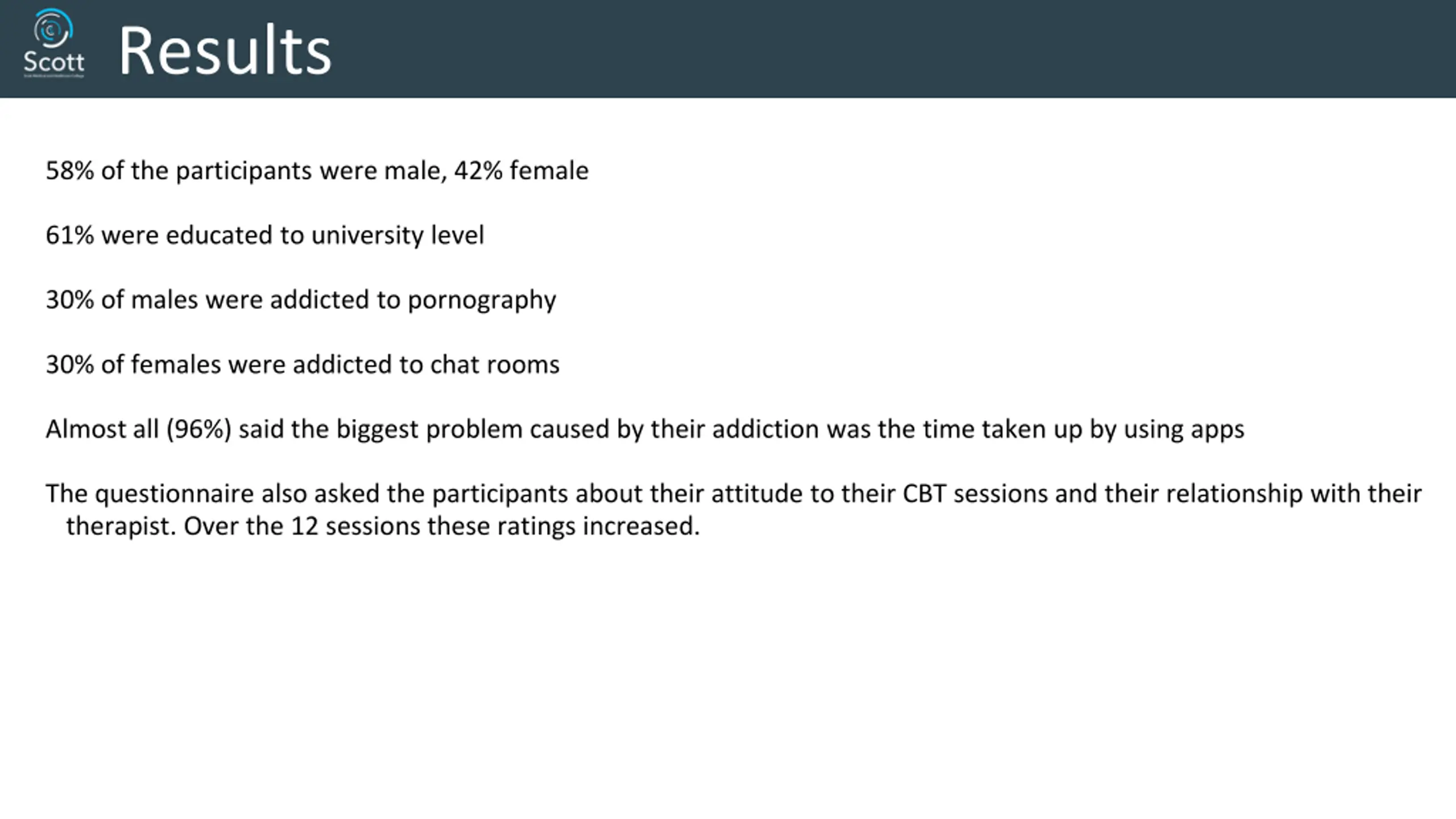 Results 58% of the participants were male, 42% female 61% were educated to university level 30% of males were addicted to pornography 30% of females were addicted to chat rooms Almost all (96%) said the biggest problem caused by their addiction was the time taken up by using apps The questionnaire also asked the participants about their attitude to their CBT sessions and their relationship with their therapist. Over the 12 sessions these ratings increased.