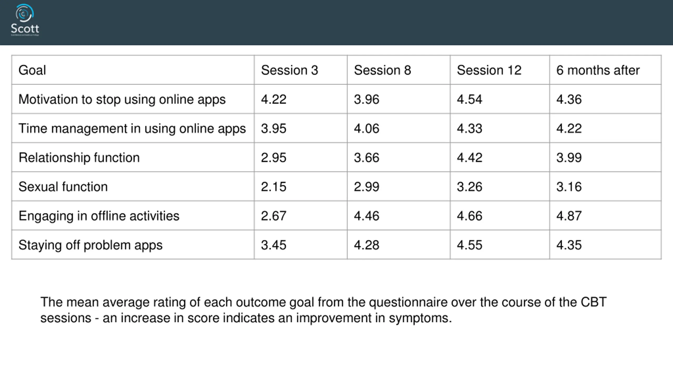 Goal Session 3 Session 8 Session 12 6 months after Motivation to stop using online apps 4.22 3.96 4.54 4.36 Time management in using online apps 3.95 4.06 4.33 4.22 Relationship function 2.95 3.66 4.42 3.99 Sexual function 2.15 2.99 3.26 3.16 Engaging in offline activities 2.67 4.46 4.66 4.87 Staying off problem apps 3.45 4.28 4.55 4.35 The mean average rating of each outcome goal from the questionnaire over the course of the CBT sessions - an increase in score indicates an improvement in symptoms.